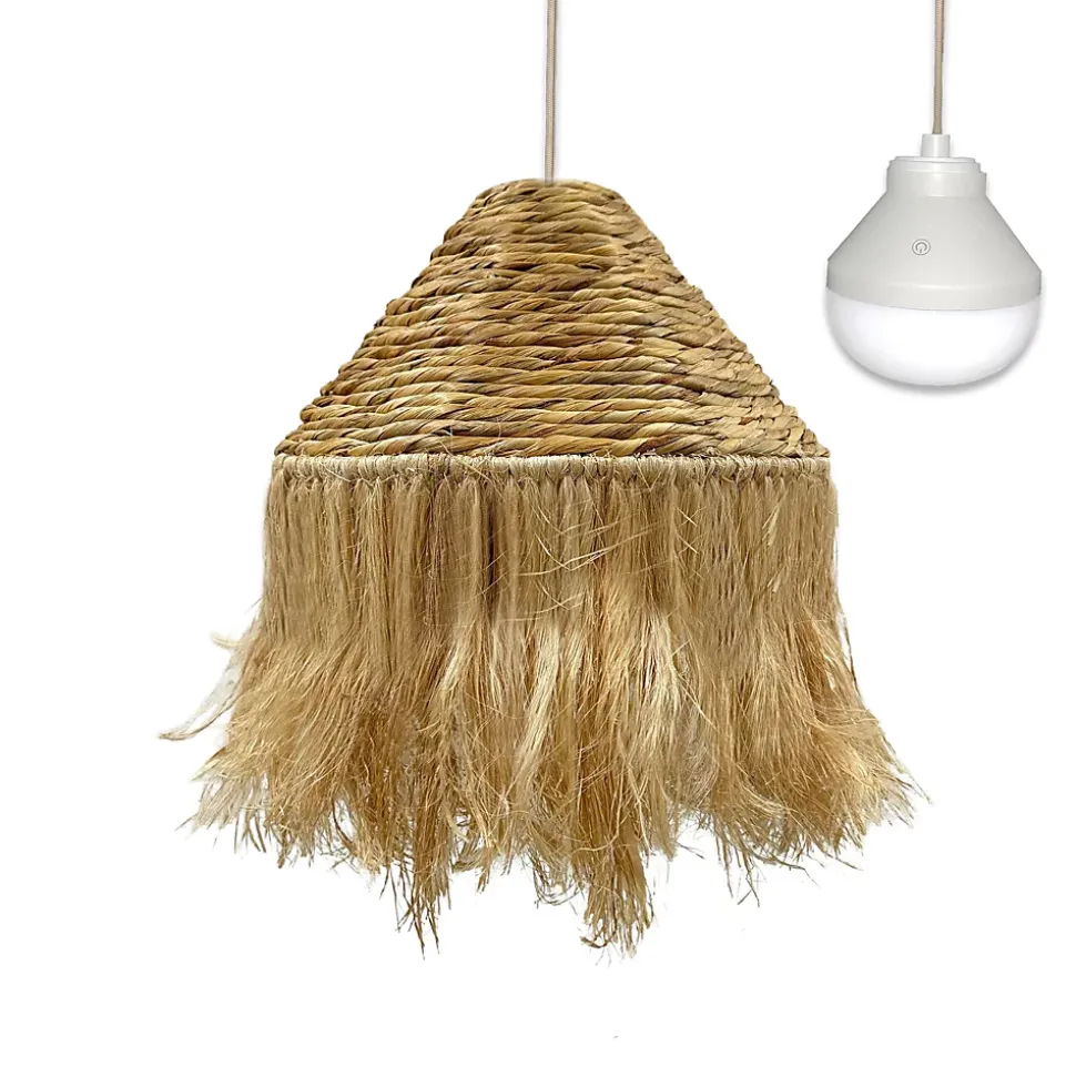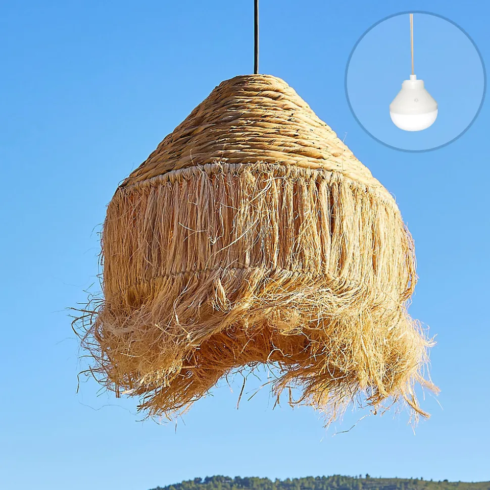 La suspension artisanale Leonora Nomad est fabriquée en jacinthe d’eau naturelle offrant un tressage souple et rigide au look ethnique chic. Ce luminaire de 44 cm de diamètre pour 52 cm de hauteur est livré avec l’ampoule LED autonome Lys proposant un éclairage blanc chaud et multicolore RGB. Grâce à son système magnétique et sa télécommande incluse, elle se suspend librement n’importe où sans raccordement électrique pour accompagner vos moments de détente. Sa batterie rechargeable assure une autonomie technique de 12 heures. Certifiée IP44, elle est protégée contre les projections d’eau pour un usage extérieur sous abri. Maintenez l’abat-jour au sec. L’entretien reste simple : un chiffon doux suffit pour conserver un rendu soigné au fil des saisons. En jouant sur la hauteur et le positionnement, vous pouvez créer des zones lumineuses plus marquées ou au contraire un éclairage plus diffus.