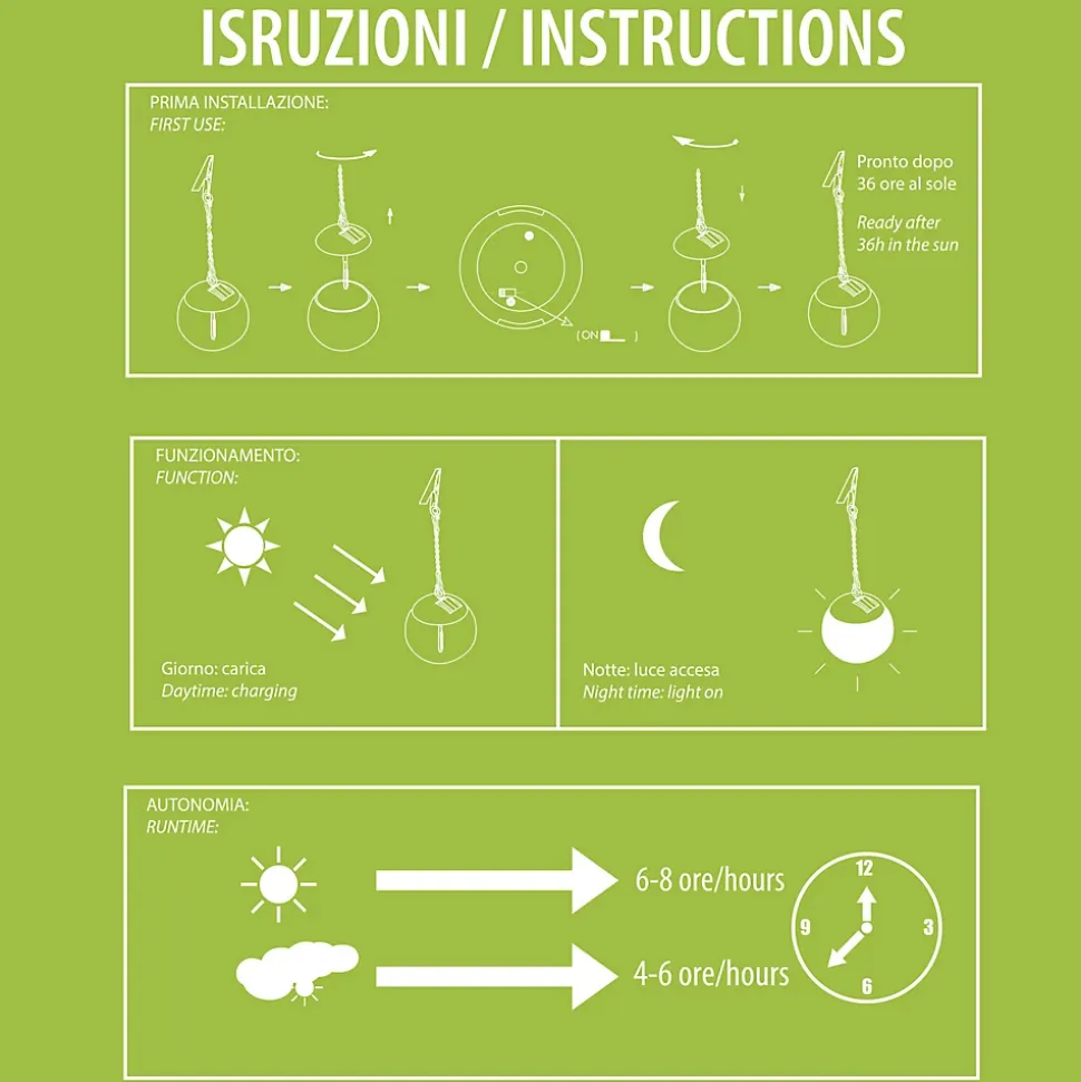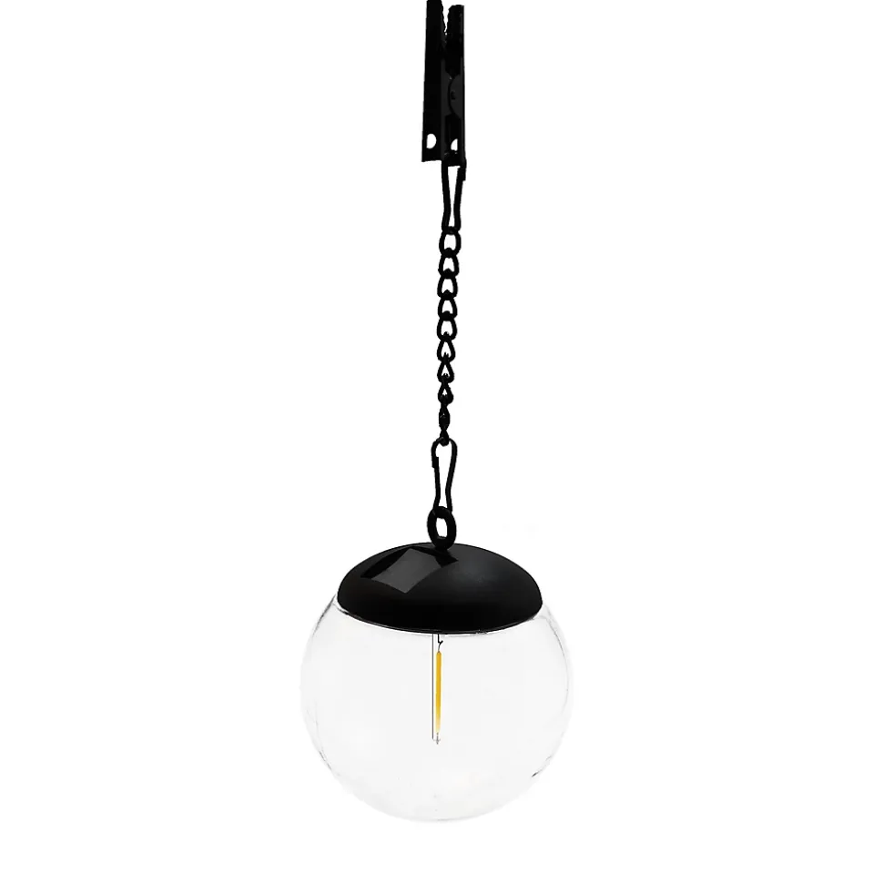 Haute luminosité avec un design unique : ces lampes solaires à économie d’énergie sont simples mais élégantes. La forme sphérique de 10 cm lui permet de se fondre dans différents environnements. Lumière chaude 3000K et ampoule effet ‘filament’ : pour donner une touche de chaleur et de raffinement à votre jardin, terrasse, gazebo, balcon…. Imperméable et durable : haute étanchéité signifie une excellente résistance aux intempéries et à l’eau. La spère est fabriquée en matériau ABS haute résistance, elle ignore la rouille pour une utilisation à long terme. Fonctionnement : la lampe se recharge pendant la journée, grâce aux rayons du soleil. Elle s’allume toute seule quand il fait noir. Effet ‘filament’ avec lumière chaude 3000K : elle fait de votre jardin, balcon ou terrasse un endroit spécial et chaleureux. Équipée d’un panneau solaire monocristallin et d’une batterie 150mAh NI-Mh; elle peut être fixée à l’aide de la pratique pince. Longueur de la chaîne : 10 cm. Autonomie : jusqu’à 6 heures en fonction de la charge reçue dans la journée.