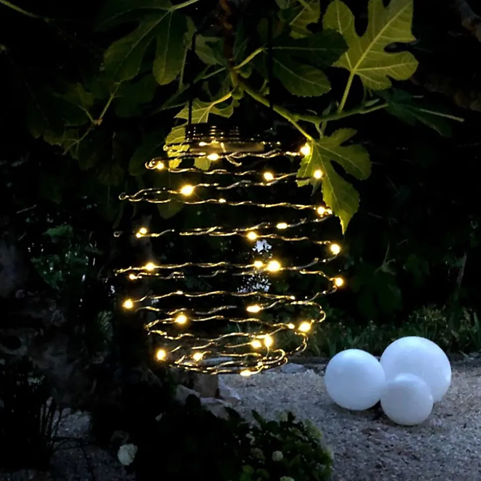 Suspension solaire design spiralé noir acier, micro LED blanc chaud, autonomie jusqu’à 6 heures, protection IP44 contre les éclaboussures, idéale pour éclairage extérieur et intérieur, économe en énergie grâce à la recharge solaire.