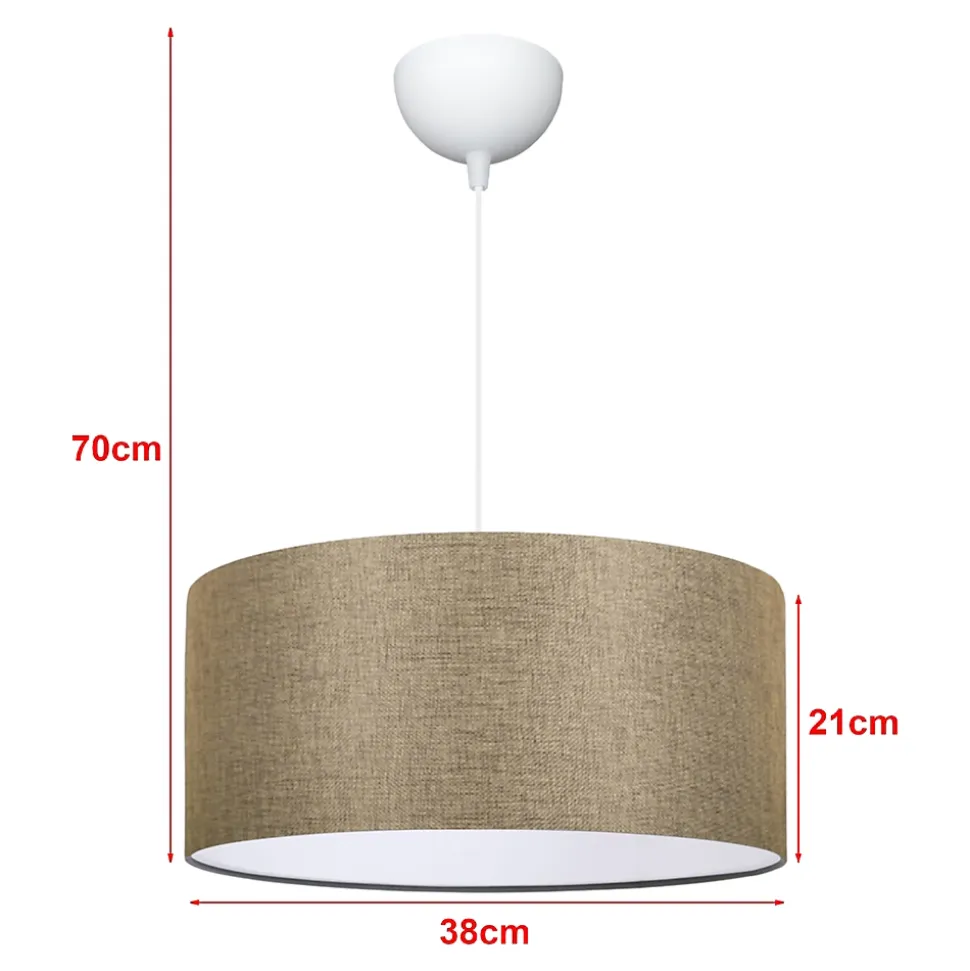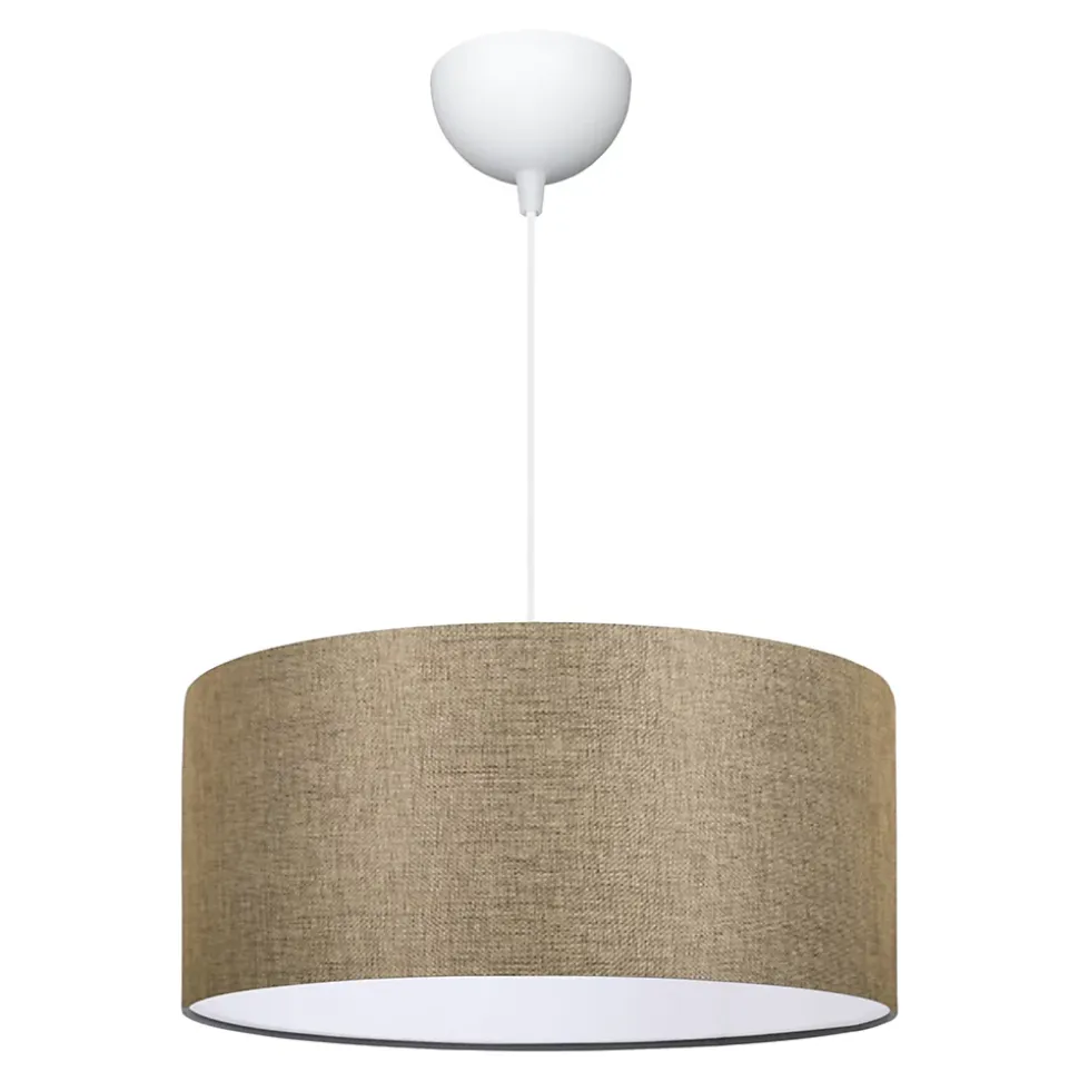 SuspensionCette élégante suspension lumineuse modernisera la pièce en s’intégrant parfaitement à la décoration intérieure de la maison.Description :- luminaire de design original- idéale pour toutes les pièces de la maison- doté d’une douilleCaractéristiques :- douille : 1 x E27, max. 20W (livraison sans ampoule)- alimentation : 230V, 50Hz- type d’interrupteur : muralMatière :- élément de fixation : plastique- abat-jour : tissu (100 % polyester)Dimensions :- hauteur totale : 70 cm- abat-jour (hauteur x diamètre) : 21 x 38 cmCouleur :- élément de fixation : blanc- abat-jour : beigeContenu de la livraison :1 x suspension[l’ampoule ne fait pas partie de l’offre]Produit de la marque :[lux.pro]