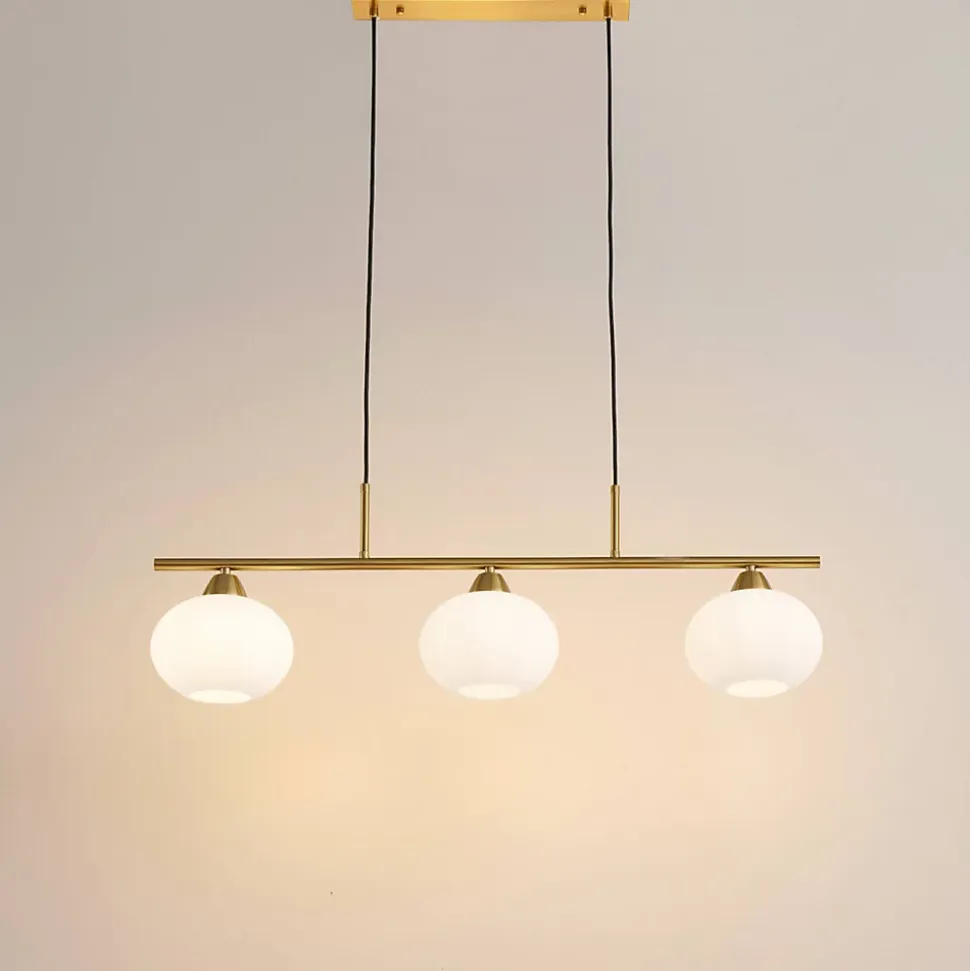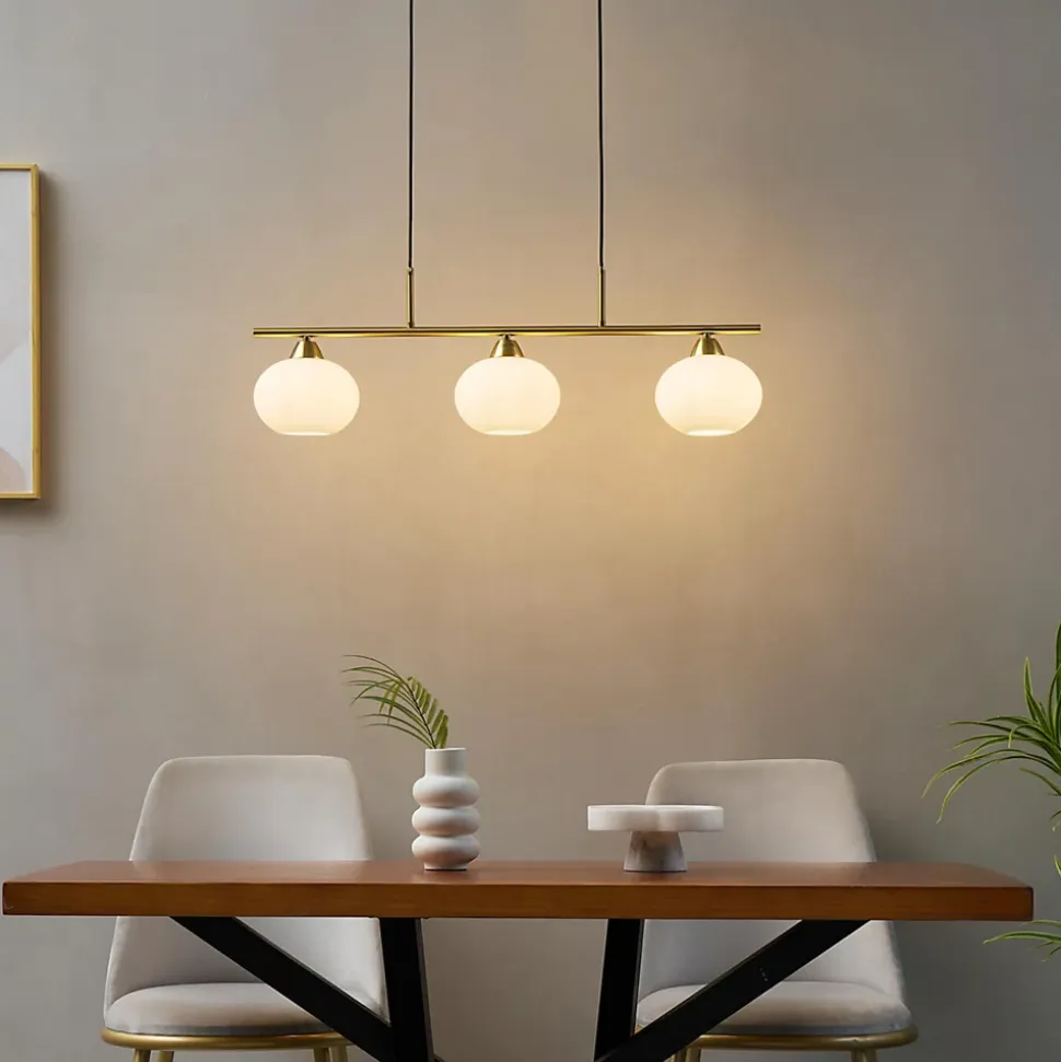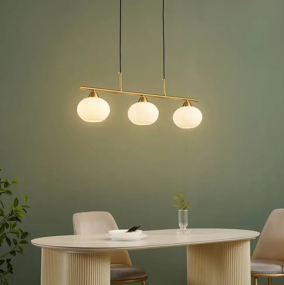 Illuminez votre intérieur avec la suspension Alcyone, qui se distingue par sa structure triple en laiton et ses abat-jours en verre blanc. Ce luminaire diffuse une lumière subtile et raffinée, apportant une touche d’élégance à votre espace. Il fonctionne avec trois ampoules E27 (non incluses) et s’intègre parfaitement au-dessus d’une table à manger ou dans une cuisine moderne, alliant design contemporain et éclairage chaleureux.) Assemblage simple requis (