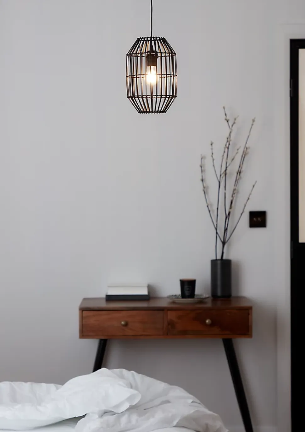 Nos suspensions ont été conçues dans un certain nombre de formes, de matières et de finitions pour vous permettre de trouver facilement celle qui vous convient. Cette suspension en fibre naturelle foncée peut parfaitement servir de source de lumière principale