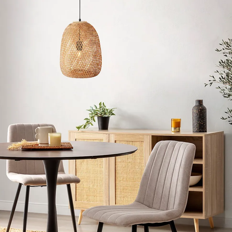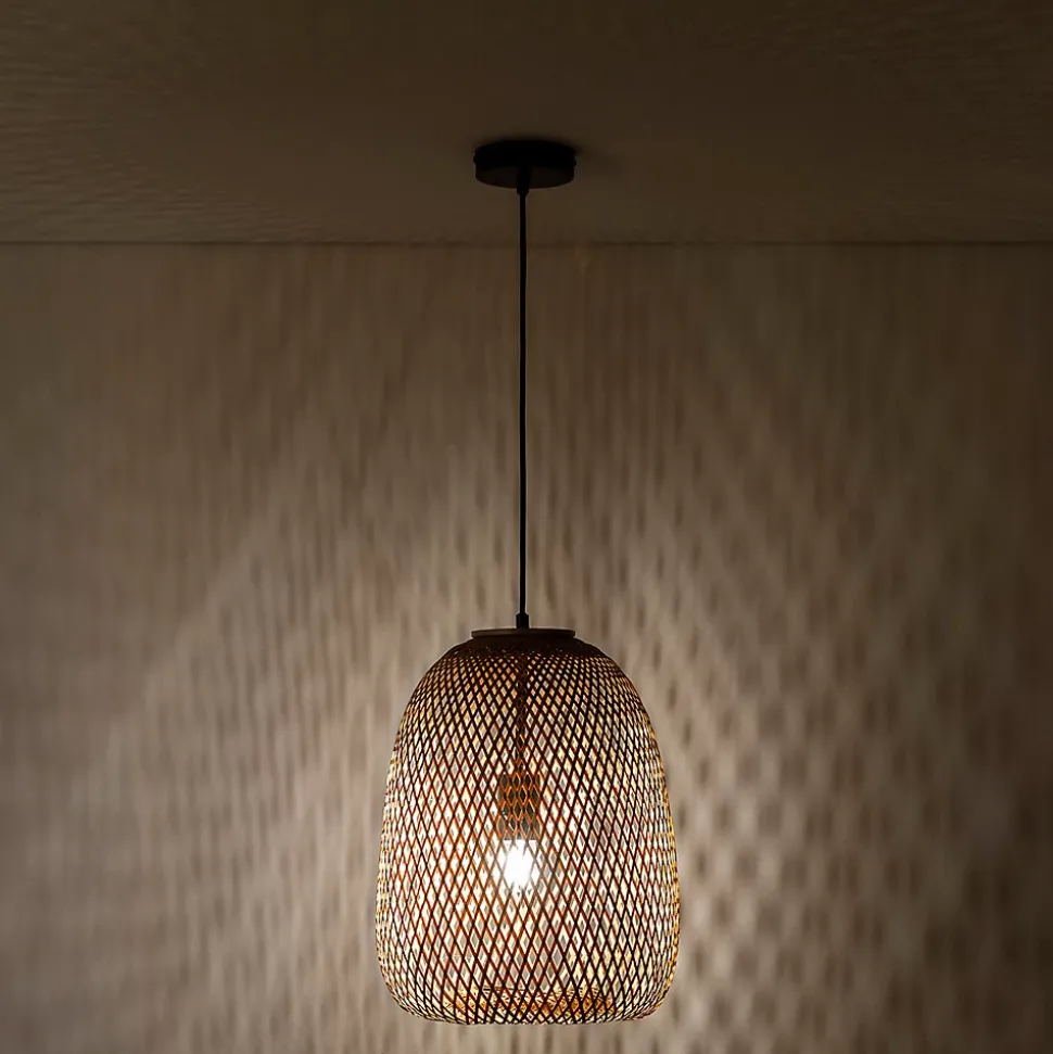 PLAFONNIER EN BAMBOU YUMEIPrincipales caractéristiques de la lampe:· Le plafonnier Yumei est fabriqué en bambou, la matière en fibre végétale devenue si tendance dans le secteur de la décoration d’intérieur. En fait, ces types de lampes ont été tissées avec des cannes de bambou faites à la main; Il a une tresse naturelle très attrayante.· La composition avec ce tressage stratégique rend ces lampes résistantes, stables et, en même temps, élastiques.· Elles sont idéales pour une décoration nordique, un courant esthétique qui prône des matériaux naturels qui apportent de la chaleur à l’environnement.· Yumei est une suspension qui donnera un aspect sensationnel à n’importe quelle pièce. Traditionnellement, ces types d’accessoires étaient vus dans les pays asiatiques d’où provenait ce matériau. Cependant, il est maintenant courant de concevoir ces lampes n’importe où et de conserver leur authenticité.· Fabriqué à la main: Cette lampe est fabriquée à la main et c’est pourquoi ses irrégularités font partie de son charme naturel; vous ne verrez pas un luminaire égal à l’autre.· AMPOULE NON INCLUSE· Facile à assembler: le produit comprend un manuel d’instructions très facile à suivre.Dimensions du plafonnier Yumei:· Hauteur: 120 cm· Largeur: 29,5 cm· Profondeur: 29,5 cm· Hauteur du corps de la lampe: 37,3 cm· Poids: 0,55 kg