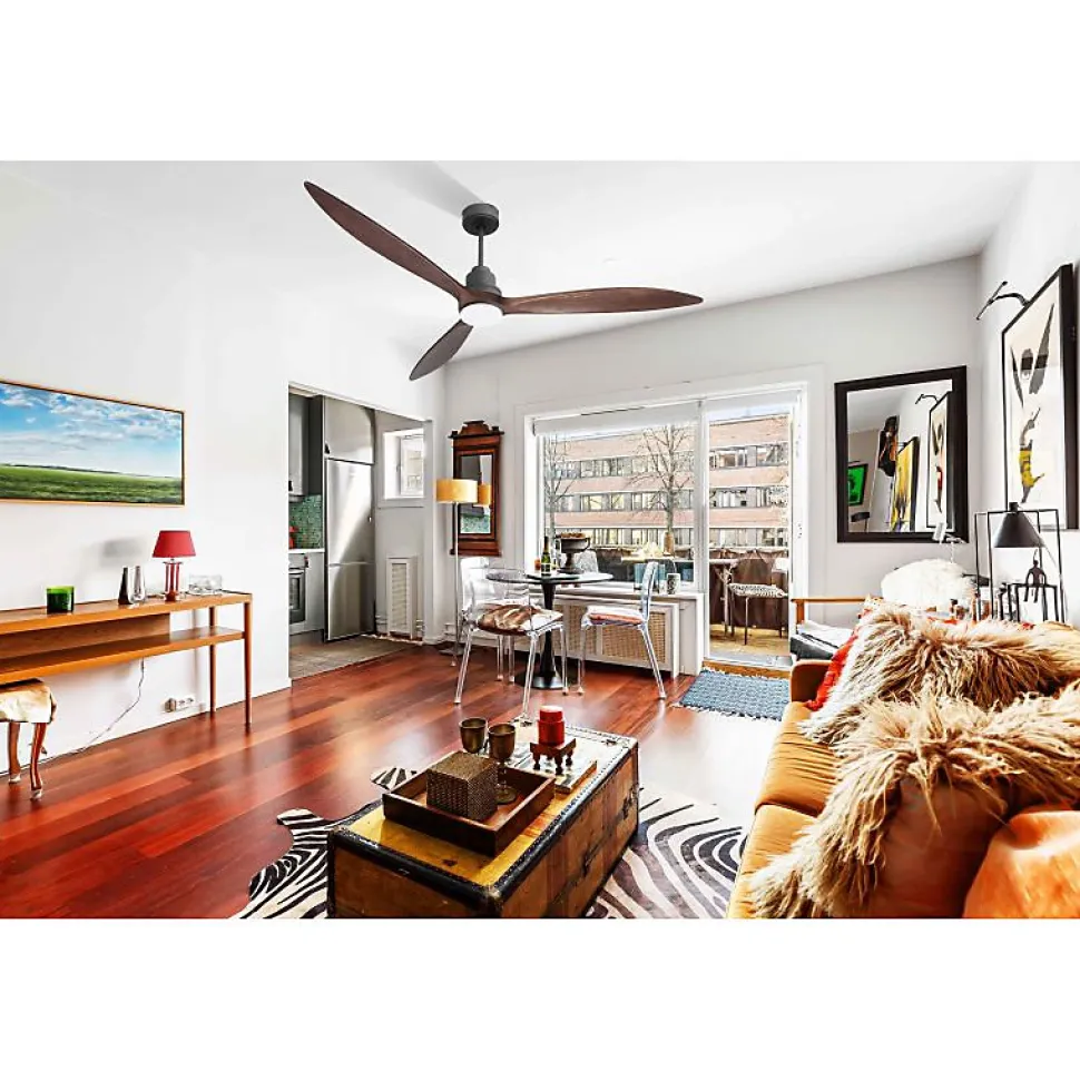 TenerifeTE1_P8Dw166_L1sLe ventilateur de plafond Tenerife est un modèle polyvalent et innovant, conçu pour offrir une ventilation optimale en été et une récupération efficace de la chaleur en hiver. Ce produit se distingue par son design moderne et ses fonctionnalités avancées, en faisant un choix idéal pour réguler la température de votre intérieur tout en réalisant des économies d’énergie.Fonctionnalités et AvantagesLe Tenerife ne se contente pas d’être un simple ventilateur, c’est un véritable régulateur thermique. Grâce à son moteur à courant continu (DC) 100% cuivre avec roulements à billes auto-lubrifiés, il garantit un fonctionnement silencieux et sans souci. Ce moteur permet un contrôle précis de la vitesse avec 6 niveaux disponibles, tout en assurant une faible consommation énergétique. Découvrez notre gamme de ventilateurs Hyper Silence, pratiquement inaudibles jusqu’à la vitesse 3.Le ventilateur est livré avec deux tiges de plafond de 12,5 cm et 25 cm, avec des options supplémentaires de tiges de 60, 120 et 180 cm pour s’adapter à votre espace.Design et PersonnalisationLes pales du Tenerife sont disponibles en ABS léger et résistant ou en bois, et vous pouvez choisir d’en installer 2 ou 3 selon vos préférences. Le modèle P8 est idéal pour des pièces de 30 à 60 m² en été et de 90 à 120 m² en hiver. Avec un diamètre de 166 cm et une finition en bois sombre, il s’intègre parfaitement dans tout intérieur moderne.Technologie IntégréeChaque ventilateur Tenerife e