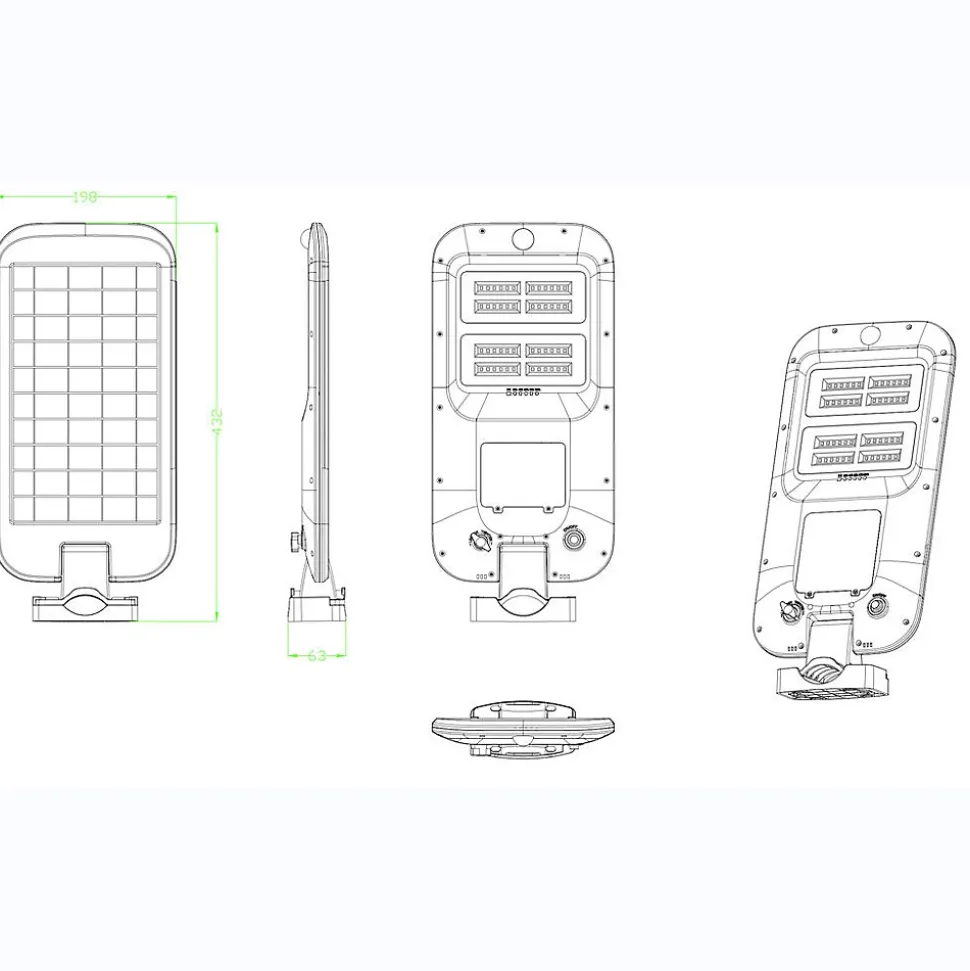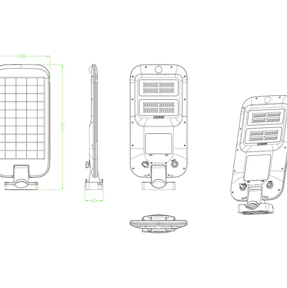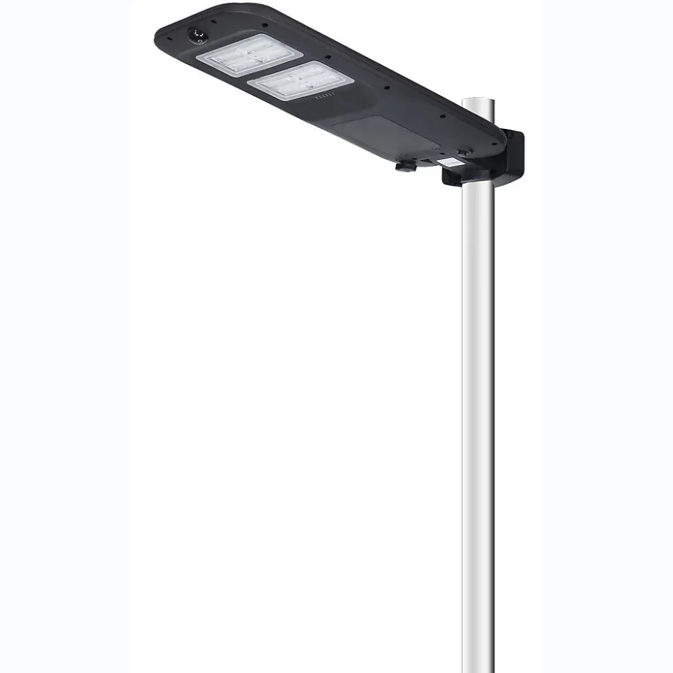 Tête de lampadaire solaire haute intensité avec détecteur de présence2 types de montages : sur mât ou fixation muraleMatière : ABS renforcé – résistant aux chocs et aux intempériesFlux lumineux : 2000 lumens – éclairage puissant et homogènePanneau solaire : Monocristallin – 6V / 8W, rendement énergétique optimiséAngle de diffusion : 135° – large couverture lumineuseDurée maximum d’éclairage : 10 – 12 heuresIndice de protection : IP65 – étanchéité totale à la poussière et à l’eauInterrupteur on/off1 télécommande multifonctions incluseLED : 48 LED SMD 2835 blanc froid (6500K)Batteries rechargeables : 1 x 7,5Ah 3,2V LiFePO4Dimensions produits : (voir le schéma technique parmi les images)198 x 63 x 432