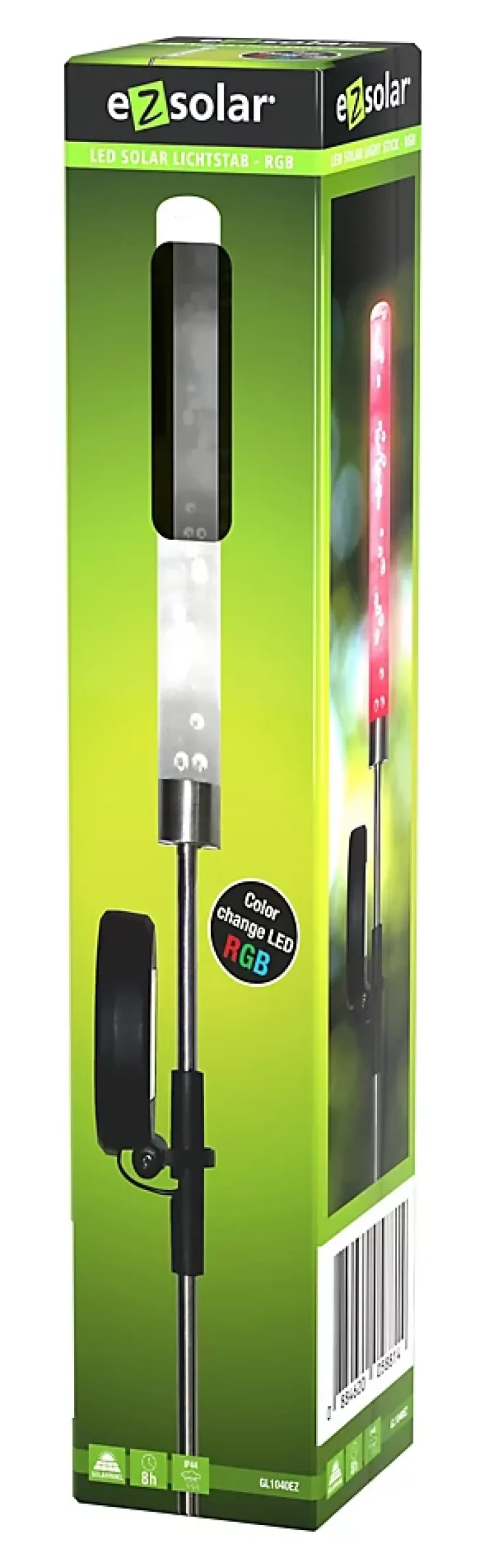 Bâton solaire LED avec bullesRGB – changement de couleur – 1 LED Durée d’utilisation : Jusqu’à 6-8hMatériau : Plastique, acier inoxydable Dimensions : H50 x Ø 3 cm H50 x Ø 3 cm y compris le piquet de terrePanneau solaire amorphe 4 x 4 cm