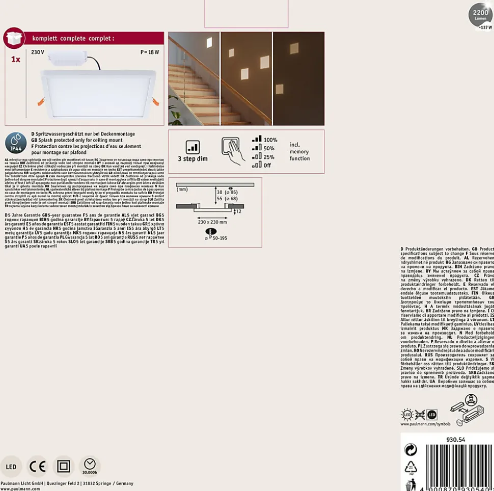 Le panneau encastré carré Areo avec les dimensions de 230×230 mm et une puissance de 16 watts en Blanc fournit une lumière étendue blanc chaud. Grâce à la technologie VariFit flexible, les ressorts de serrage pour le montage sont réglables en continu entre 50 et 195 mm. Le panneau peut ainsi être encastré dans des trous de perçage déjà présents ou dans de nouveaux trous avec couronne de forage standard. Avec sa fonction intégrée gradable sur 3 niveaux, il offre trois intensités de lumière en actionnant plusieurs fois un simple commutateur traditionnel. La fonction Mémoire enregistre le dernier niveau d’intensité sélectionné jusqu’à la prochaine utilisation.Pour un diamètre d’alésage supérieur à 85 mm, une profondeur de cavité d’au moins 30 mm est requise et pour un diamètre supérieur à 68 mm, une profondeur d’au moins 55 mm est requise.