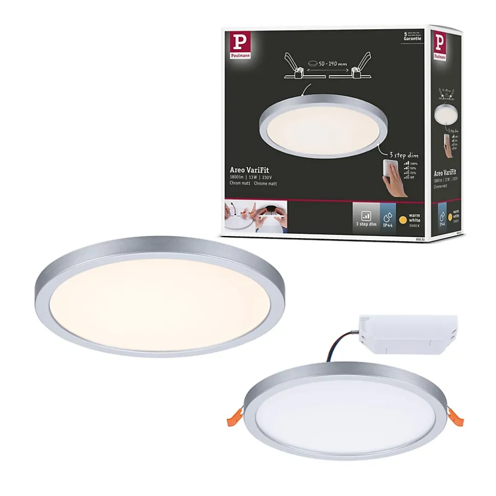 Le panneau encastré rond Areo avec un diamètre de 175 mm et une puissance de 13 watts en Chrome mat fournit une lumière étendue blanc chaud. Grâce à la technologie VariFit flexible, les ressorts de serrage pour le montage sont réglables en continu entre 50 et 140 mm. Le panneau peut ainsi être encastré dans des trous de perçage déjà présents ou dans de nouveaux trous avec couronne de forage standard. Avec sa fonction intégrée gradable sur 3 niveaux, il offre trois intensités de lumière en actionnant plusieurs fois un simple commutateur traditionnel. La fonction Mémoire enregistre le dernier niveau d’intensité sélectionné jusqu’à la prochaine utilisation.Pour un diamètre d’alésage supérieur à 85 mm, une profondeur de cavité d’au moins 30 mm est requise et pour un diamètre supérieur à 68 mm, une profondeur d’au moins 55 mm est requise.