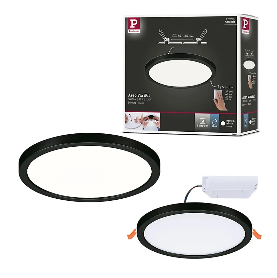 Avec une puissance de 13W, le ronde panneau encastré LED Areo VariFit de couleur Noir et mesurant 175mm est idéal pour l’éclairage de base des salons, chambres ou cuisines. La lumière blanc neutre du panneau permet d’éclairer la pièce de manière uniforme et étendue. Avec sa fonction intégrée gradable sur 3 niveaux, il offre trois intensités de lumière en actionnant plusieurs fois un simple commutateur traditionnel. La fonction Mémoire enregistre le dernier niveau d’intensité sélectionné jusqu’à la prochaine utilisation. Grâce à la technologie VariFit flexible, les ressorts de serrage pour le montage sont réglables en continu entre 50 et 140 mm. Le panneau peut ainsi être encastré dans des trous de perçage déjà présents ou dans de nouveaux trous.