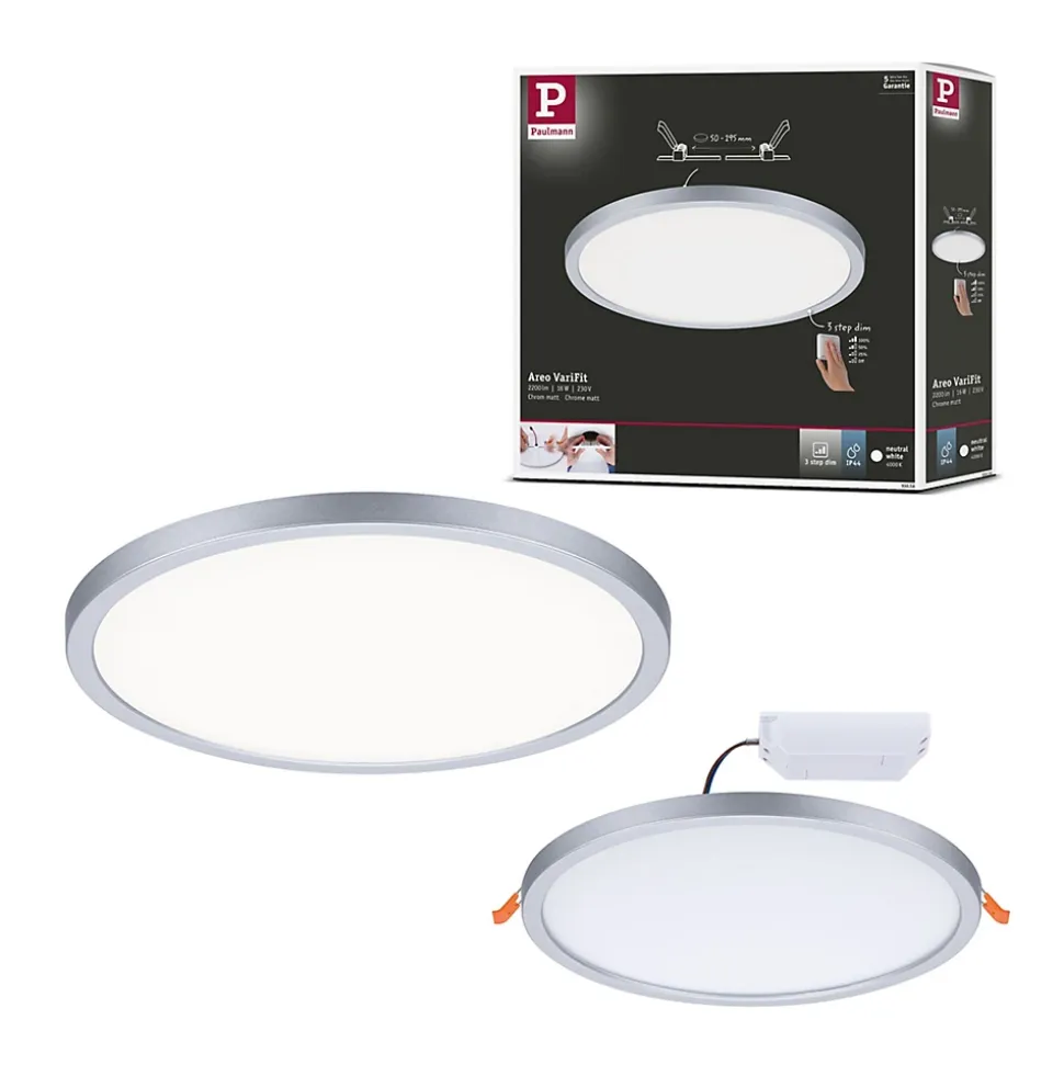 Le panneau encastré rond Areo avec un diamètre de 230 mm et une puissance de 16 watts en Chrome mat fournit une lumière étendue blanc neutre. Grâce à la technologie VariFit flexible, les ressorts de serrage pour le montage sont réglables en continu entre 50 et 195 mm. Le panneau peut ainsi être encastré dans des trous de perçage déjà présents ou dans de nouveaux trous avec couronne de forage standard. Avec sa fonction intégrée gradable sur 3 niveaux, il offre trois intensités de lumière en actionnant plusieurs fois un simple commutateur traditionnel. La fonction Mémoire enregistre le dernier niveau d’intensité sélectionné jusqu’à la prochaine utilisation.Pour un diamètre d’alésage supérieur à 85 mm, une profondeur de cavité d’au moins 30 mm est requise et pour un diamètre supérieur à 68 mm, une profondeur d’au moins 55 mm est requise.
