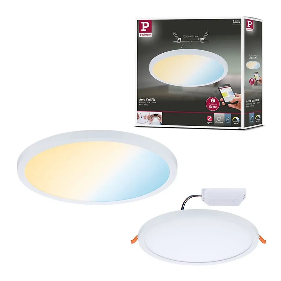Le panneau encastré rond Areo avec un diamètre de 230 mm et une puissance de 16 watts en Blanc fournit une lumière étendue non éblouissante. Grâce à la technologie VariFit flexible, les ressorts de serrage pour le montage sont réglables en continu entre 50 et 195 mm. Le panneau peut ainsi être encastré dans des trous de perçage déjà présents ou dans de nouveaux trous avec couronne de forage standard. La fonction Tunable White permet de varier la température de couleur à votre guise : du blanc lumière du jour pour le travail au blanc chaud idéal pour la relaxation. L’ampoule est compatible avec Zigbee 3.0 3.0. Zigbee 3.0 est un protocole de transmission radio qui met en réseau les appareils de différents fabricants. Il permet une commande centralisée de l’éclairage que l’on peut étendre par exemple aux volets roulants, radiateurs et systèmes d’alarme.Pour un diamètre d’alésage supérieur à 85 mm, une profondeur de cavité d’au moins 30 mm est requise et pour un diamètre supérieur à 68 mm, une profondeur d’au moins 55 mm est requise.