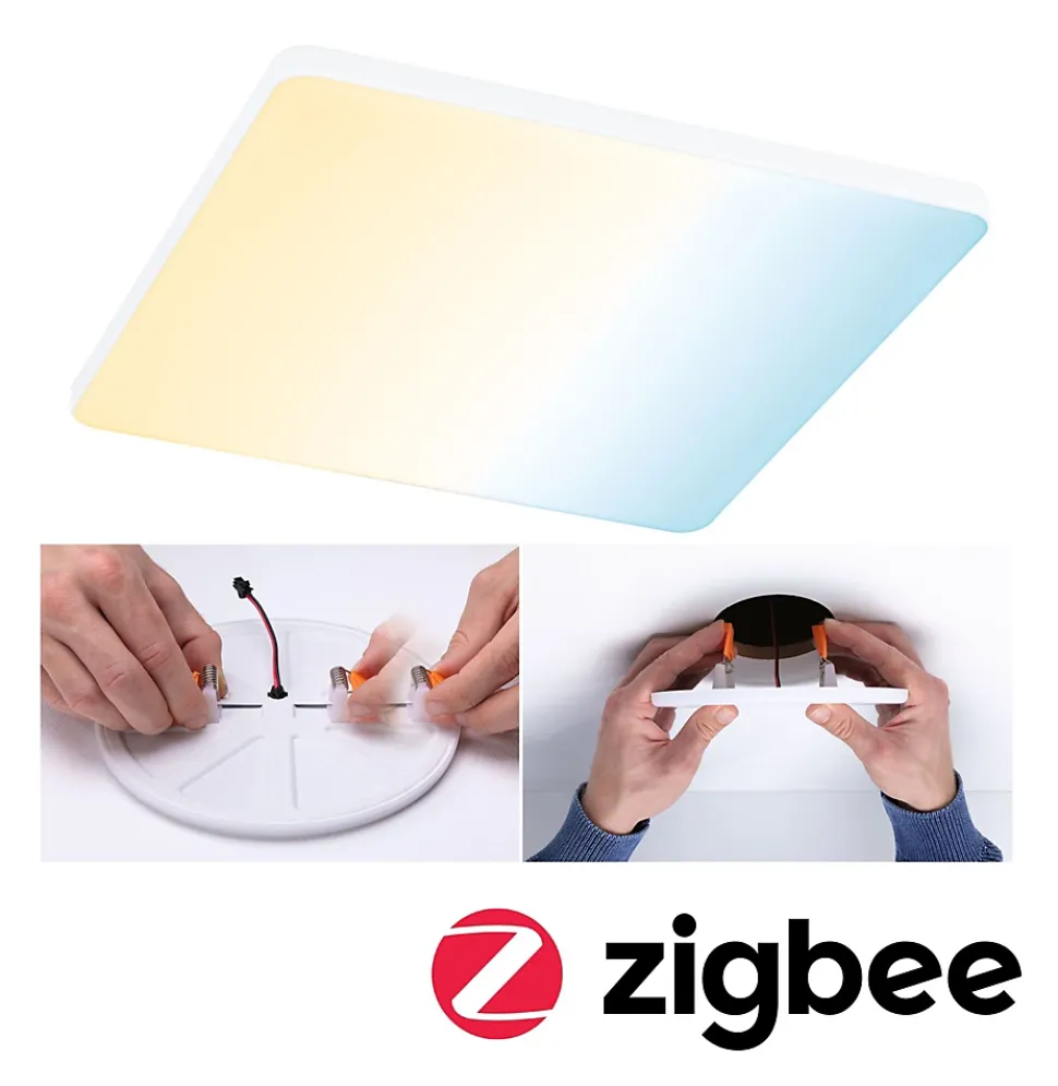 Le panneau encastré de forme carrée Veluna VariFit Edge impressionne par son design moderne et sans cadre. De dimension 200×200 mm, le panneau assure un rendement lumineux élevé et uniforme. Grâce à la technologie VariFit flexible, les ressorts de serrage pour le montage sont réglables en continu entre 68 et 180 mm. Le panneau peut ainsi être encastré dans des trous de perçage déjà présents ou dans de nouveaux trous. Pour un diamètre d’alésage supérieur à 68 mm, une profondeur de cavité d’au moins 30 mm est requise. Le couvercle en plastique satiné crée une fine diffusion de la lumière. Grâce à la commande de lumière blanche intelligente Tunable White, vous réglez en continu et personnalisez la température de couleur du luminaire – du blanc lumière du jour de l’éclairage de travail jusqu’au blanc chaud de la lumière de relaxation. Le luminaire est compatible Zigbee 3.0 3.0. Zigbee 3.0 est un protocole de transmission radio qui met en réseau les appareils de différents fabricants.