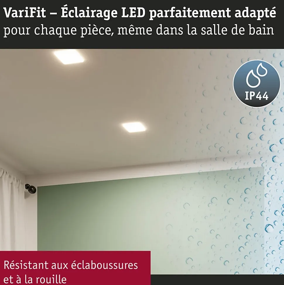 Design particulièrement plat|Réglage de la lumière blanche de blanc chaud à blanc lumière du jour|Éclairage de pièce uniforme sur la base de la technologie LED la plus récente|Rendement lumineux élevé pour une lumière longue portée|Protection contre les projections d’eau IP44, pour salle de bains|Cache en plastique satiné pour une diffusion subtile de la lumière|VariFit : montage facile avec des ressorts de serrage à ajustement sans paliers|Avec ampoule LED intégrée|Durée de vie de 50 000 heures