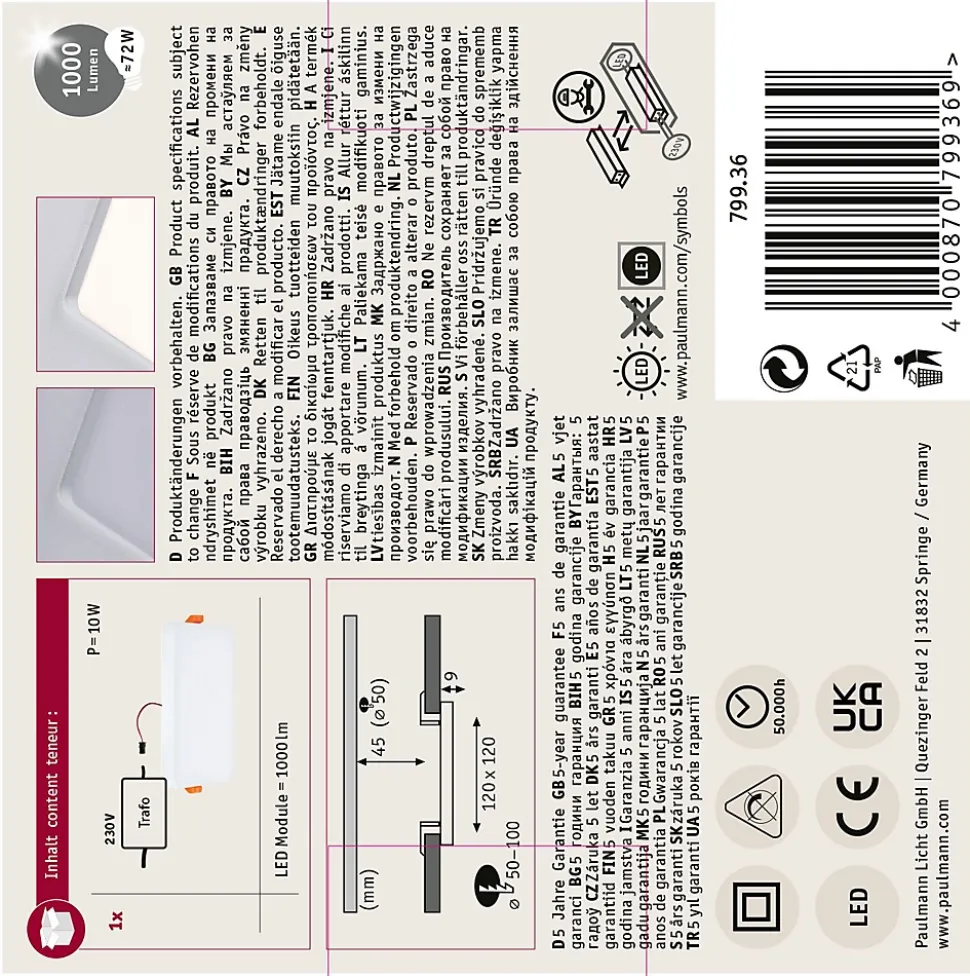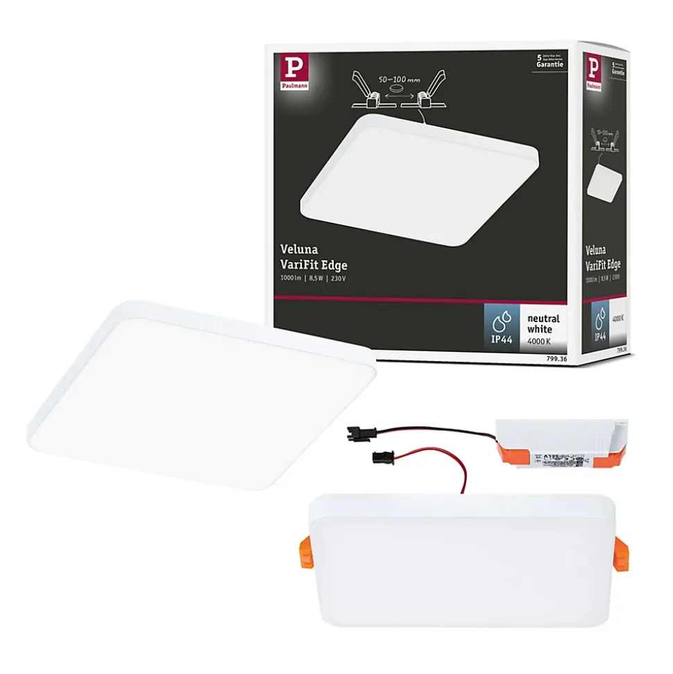 Le panneau encastré de forme carrée Veluna VariFit Edge impressionne par son design moderne et sans cadre dans un Blanc discret. Avec des dimensions de 120×120 mm et une température de couleur de 4000K, le panneau assure un rendement lumineux élevé et uniforme. Grâce à la technologie VariFit flexible, les ressorts de serrage pour le montage sont réglables en continu entre 50 et 100 mm. Le panneau peut ainsi être encastré dans des trous de perçage déjà présents ou dans de nouveaux trous. Pour un diamètre d’alésage supérieur à 50 mm, une profondeur de cavité d’au moins 45 mm est requise. Le couvercle en plastique satiné crée une fine diffusion de la lumière et une lumière d’un blanc neutre rayonnant et dynamisant.