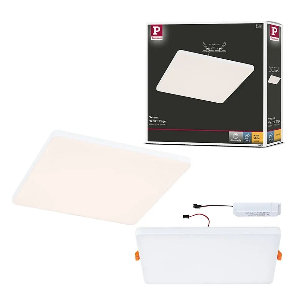 Le panneau encastré de forme carrée Veluna VariFit Edge gradable impressionne par son design moderne et sans cadre dans un Blanc discret. Avec des dimensions de 200×200 mm et une température de couleur de 3000K, le panneau assure un rendement lumineux élevé et uniforme. Grâce à la technologie VariFit flexible, les ressorts de serrage pour le montage sont réglables en continu entre 68 et 180 mm. Le panneau peut ainsi être encastré dans des trous de perçage déjà présents ou dans de nouveaux trous. Pour un diamètre d’alésage supérieur à 68 mm, une profondeur de cavité d’au moins 45 mm est requise. Le couvercle en plastique satiné crée une fine diffusion de la lumière et une lumière d’un blanc chaud rayonnant et chaleureux, qui est personnalisable grâce à la fonction de gradation.