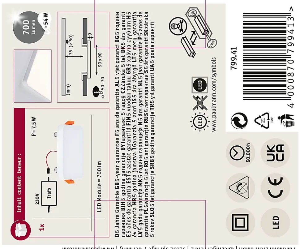 Le panneau encastré de forme carrée Veluna VariFit Edge impressionne par son design moderne et sans cadre dans un Blanc discret. Avec des dimensions de 90×90 mm et une température de couleur de 3000K, le panneau assure un rendement lumineux élevé et uniforme. Grâce à la technologie VariFit flexible, les ressorts de serrage pour le montage sont réglables en continu entre 50 et 70 mm. Le panneau peut ainsi être encastré dans des trous de perçage déjà présents ou dans de nouveaux trous. Pour un diamètre d’alésage supérieur à 50 mm, une profondeur de cavité d’au moins 35 mm est requise. Le couvercle en plastique satiné crée une fine diffusion de la lumière et une lumière d’un blanc chaud rayonnant et chaleureux.