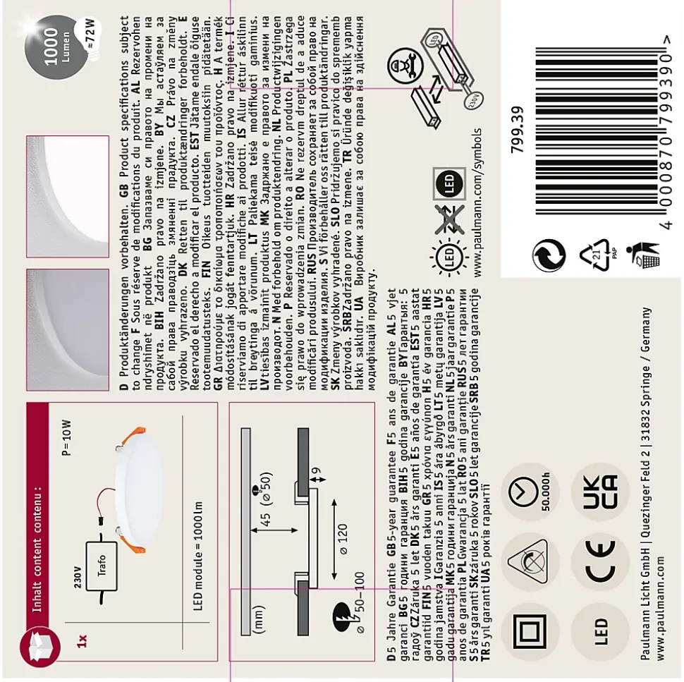 Design particulièrement plat|Température de couleur: 3000K – Blanc chaud|Éclairage de pièce uniforme sur la base de la technologie LED la plus récente|Rendement lumineux élevé pour une lumière longue portée|Protection contre les projections d’eau IP44, pour salle de bains|Cache en plastique satiné pour une diffusion subtile de la lumière|VariFit : montage facile avec des ressorts de serrage à ajustement sans paliers|Avec ampoule LED intégrée|Durée de vie de 50 000 heures