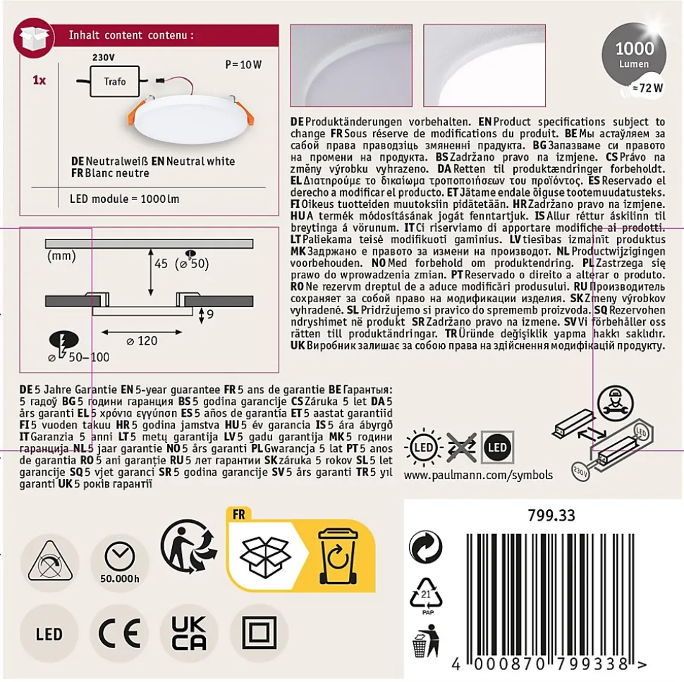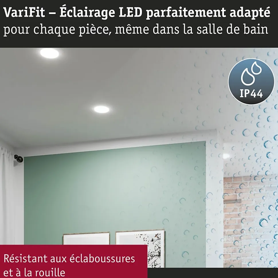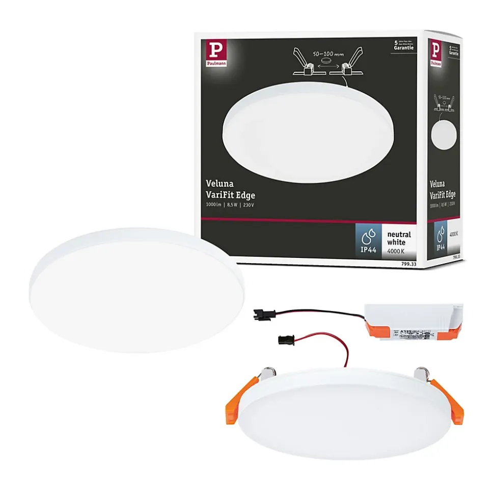 Design particulièrement plat|Température de couleur: 4000K – Blanc neutre|Éclairage de pièce uniforme sur la base de la technologie LED la plus récente|Rendement lumineux élevé pour une lumière longue portée|Protection contre les projections d’eau IP44, pour salle de bains|Cache en plastique satiné pour une diffusion subtile de la lumière|VariFit : montage facile avec des ressorts de serrage à ajustement sans paliers|Avec ampoule LED intégrée|Durée de vie de 50 000 heures