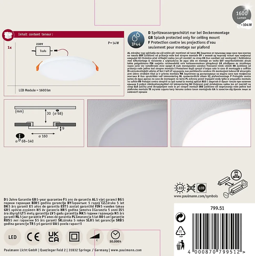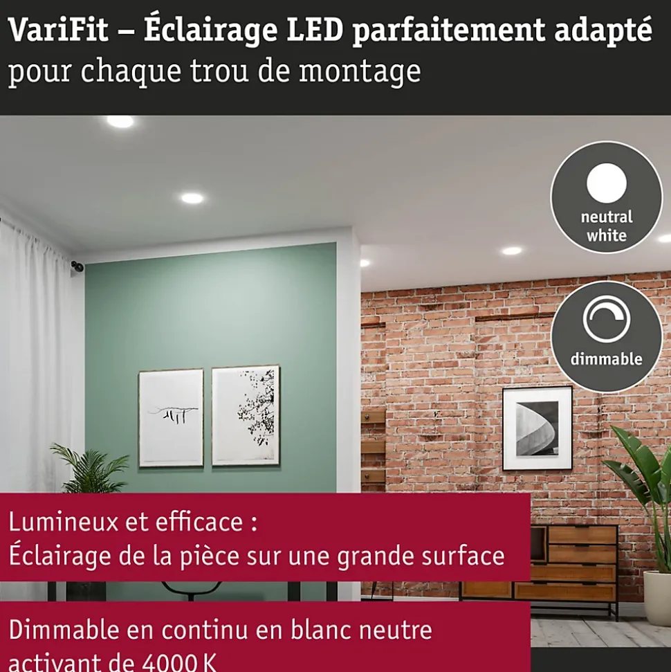 Design particulièrement plat|Température de couleur: 4000K – Blanc neutre|Éclairage de pièce uniforme sur la base de la technologie LED la plus récente|Rendement lumineux élevé pour une lumière longue portée|Protection contre les projections d’eau IP44, pour salle de bains|Cache en plastique satiné pour une diffusion subtile de la lumière|VariFit : montage facile avec des ressorts de serrage à ajustement sans paliers|Avec ampoule LED intégrée|Durée de vie de 50 000 heures|Intensité variable