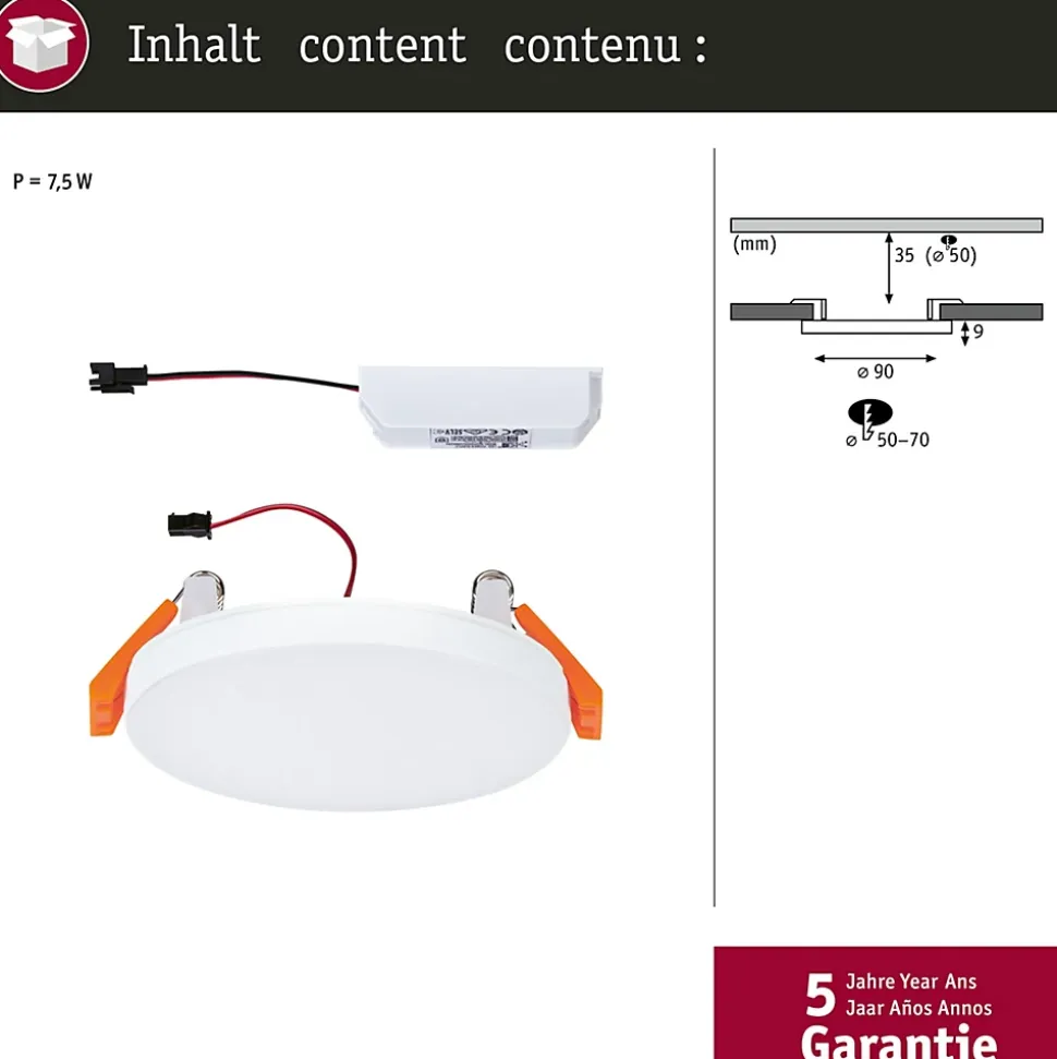 Le panneau encastré de forme ronde Veluna VariFit Edge impressionne par son design moderne et sans cadre dans un Blanc discret. Avec un diamètre de 90 mm et une température de couleur de 4000K, le panneau assure un rendement lumineux élevé et uniforme. Grâce à la technologie VariFit flexible, les ressorts de serrage pour le montage sont réglables en continu entre 50 et 70 mm. Le panneau peut ainsi être encastré dans des trous de perçage déjà présents ou dans de nouveaux trous. Pour un diamètre d’alésage supérieur à 50 mm, une profondeur de cavité d’au moins 35 mm est requise. Le couvercle en plastique satiné crée une fine diffusion de la lumière et une lumière d’un blanc neutre rayonnant et dynamisant.