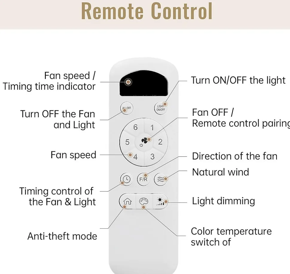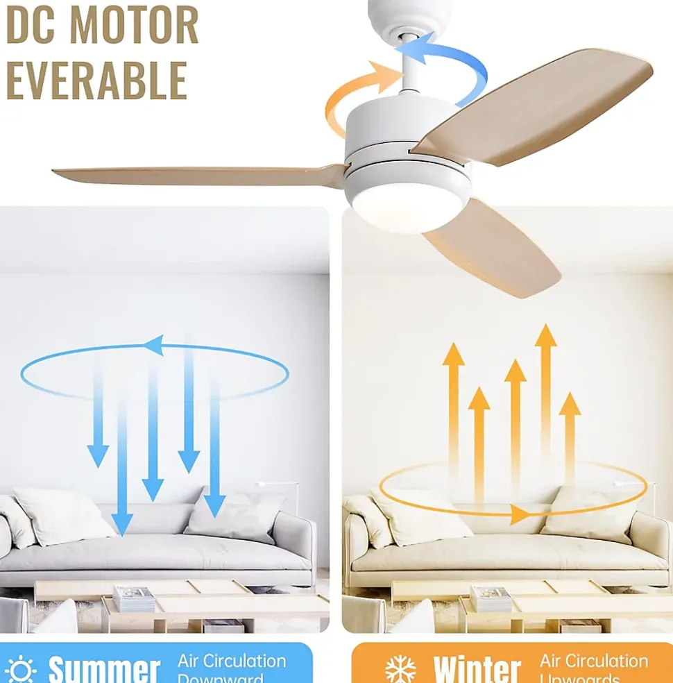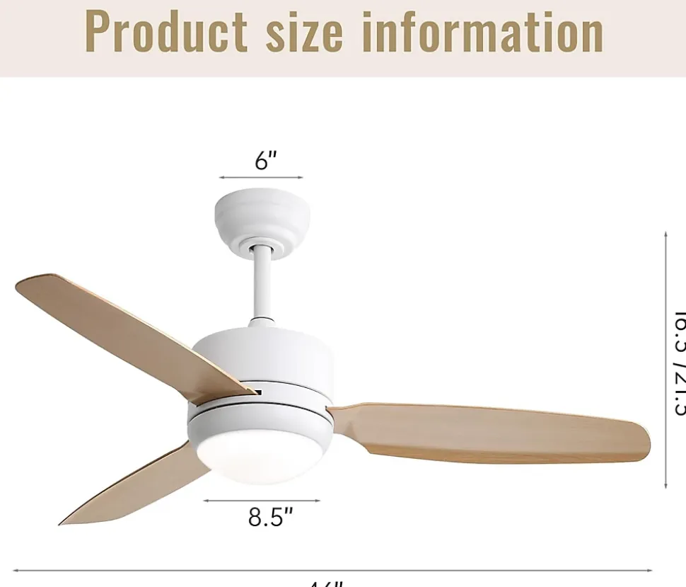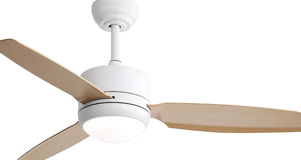 【Moteur à courant continu】 Equipé d’un moteur à courant continu réversible, il assure un flux d’air puissant et silencieux tout en étant économe en énergie, idéal pour l’été comme pour l’hiver.【Blades en ABS】 Conçu avec des pales en ABS de haute qualité, résistantes à la chaleur et à la corrosion, ce ventilateur est plus léger et plus efficace que les ventilateurs traditionnels à pales en bois.【Éclairage LED réglable】 Le ventilateur dispose d’un kit LED 18W avec trois températures de couleur ajustables (lumière froide, naturelle et chaude), offrant une lumière ambiante adaptable à vos besoins.【Télécommande multifonction】 Le ventilateur de plafond est livré avec une télécommande, permettant de contrôler facilement 6 vitesses de ventilation, un réglage de la minuterie (1/4/8H) et une fonction de mémoire pour un confort personnalisé.【Design moderne et pratique】 Avec son design élégant et ses pales en bois clair, ce ventilateur est parfait pour des espaces variés comme les chambres, salons, bureaux et espaces extérieurs couverts, ajoutant une touche de style et de confort.Couleur : Corps blanc / Pales en bois clairMatériau des pales : ABSDimensions des pales : 117 cmSource d’alimentation : Moteur DC réversibleTension : 85V~265V / 50~60HzSource lumineuse : LED 18W 3CCTType de télécommande : TélécommandeFonction spéciale : MinuterieCertification : ETLTiges de suspension : 12,7 cm / 25,4 cmPièces adaptées : Chambre, salon, bureau, balcon, jardin, etc.