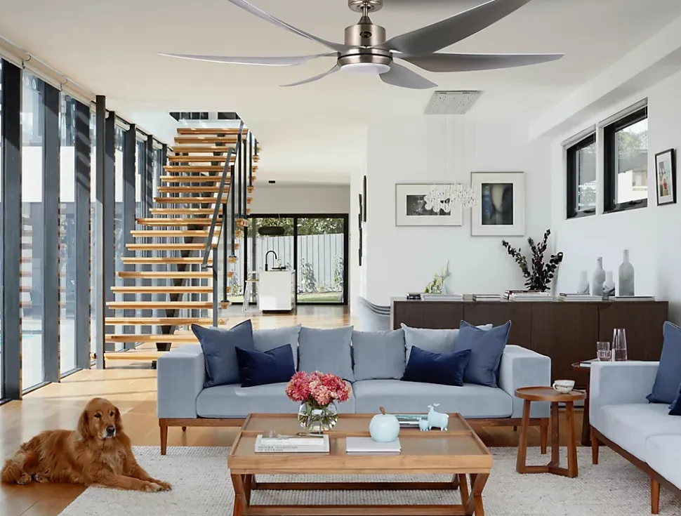 - Ventilateur de plafond connecté, usage via une application domotique possible (par exemple Tuya Smart), compatible iOS et Android