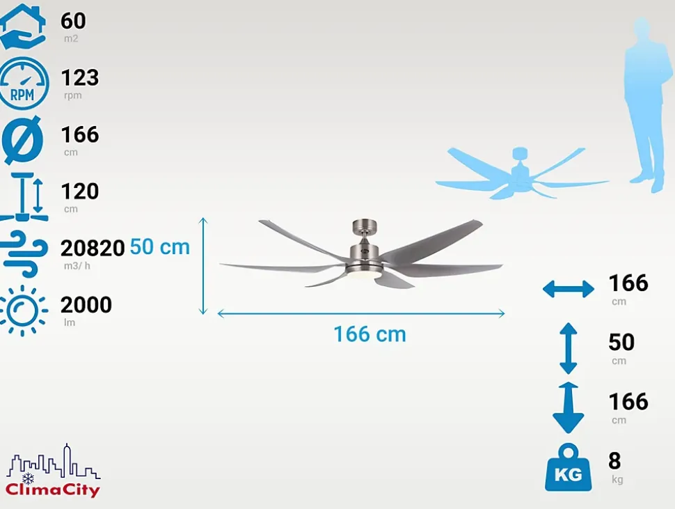 L’URIKAINE SILVER est un ventilateur de plafond à LED 24W multifonctionnel. Fabriqué en acier à haute résistance, il a un moteur à courant continu de 51W qui atteint 123 tours par minute. De plus, ses 6 lames de grand diamètre (167cm) le rendent idéal pour les grandes surfaces. Ce modèle est réversible, désestratificateur d’air, de sorte qu’en hiver vous pourrez inverser ses pales pour que son mouvement déplace l’air chaud vers le bas, agissant en complément de votre système de chauffage et favorisant une consommation optimisée. Il comprend un thermostat dans sa base de sorte que vous pouvez le programmer pour que le ventilateur fonctionne en fonction de la température ambiante. Il offre un système HYPERSILENCE, une technologie super silencieuse qui ne dépasse jamais 38dB à la vitesse 3 et qui permet d’utiliser le ventilateur la nuit ou pendant les pauses, offrant des performances très silencieuses. Il a également une fonction Mémoire qui permet d’enregistrer les paramètres utilisés, à la fois en vitesse et en lumière, de sorte que lorsque vous éteignez le ventilateur, il est enregistré et redémarré avec les mêmes paramètres. Parmi ses nombreux avantages figurent la protection IP20 contre la poussière, 6 vitesses, minuterie (8h), télécommande et connexion Wi-Fi via l’application Tuya Smart, pour contrôler le ventilateur depuis n’importe quel appareil mobile. Son design argenté est élégant. Il comprend deux tiges de 25cm et 12.5 et accepte les tiges de 60cm, ce qui le rend adapté à tous les types de plafonds.