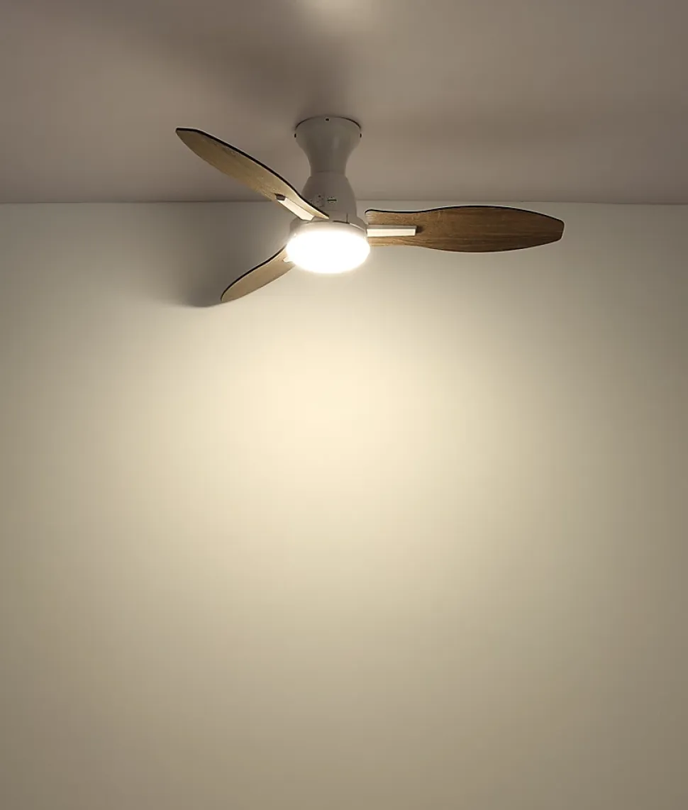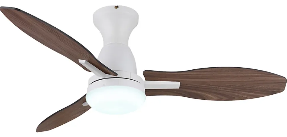 Ventilateur de plafond métal blanc mat, plastique décor bois foncé, décor bois clair, plastique opale, Plusieurs intensités à gérer par un interrupteur mural, couleur fixe, Fonction de mémoire, Timer, Télécommande, Batterie incluse 2x AAA, Puissance moteur maximale 35W, Utilisation optimale de l’espace 25m², Abkühlung, Aufheizen, Niveaux de vitesse 80/120/150/180/210/230 RPM, ø: 1070mm, H: 350mm, incl. LED 22W 230V, 2570lm Source, 1897lm Output, CCT 3000/4200/6000K