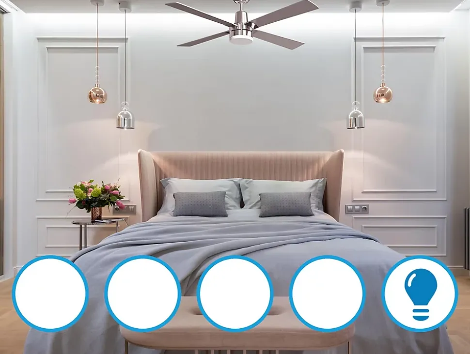 - Ventilateur de plafond connecté, usage via une application domotique possible (par exemple Tuya Smart), compatible iOS et Android