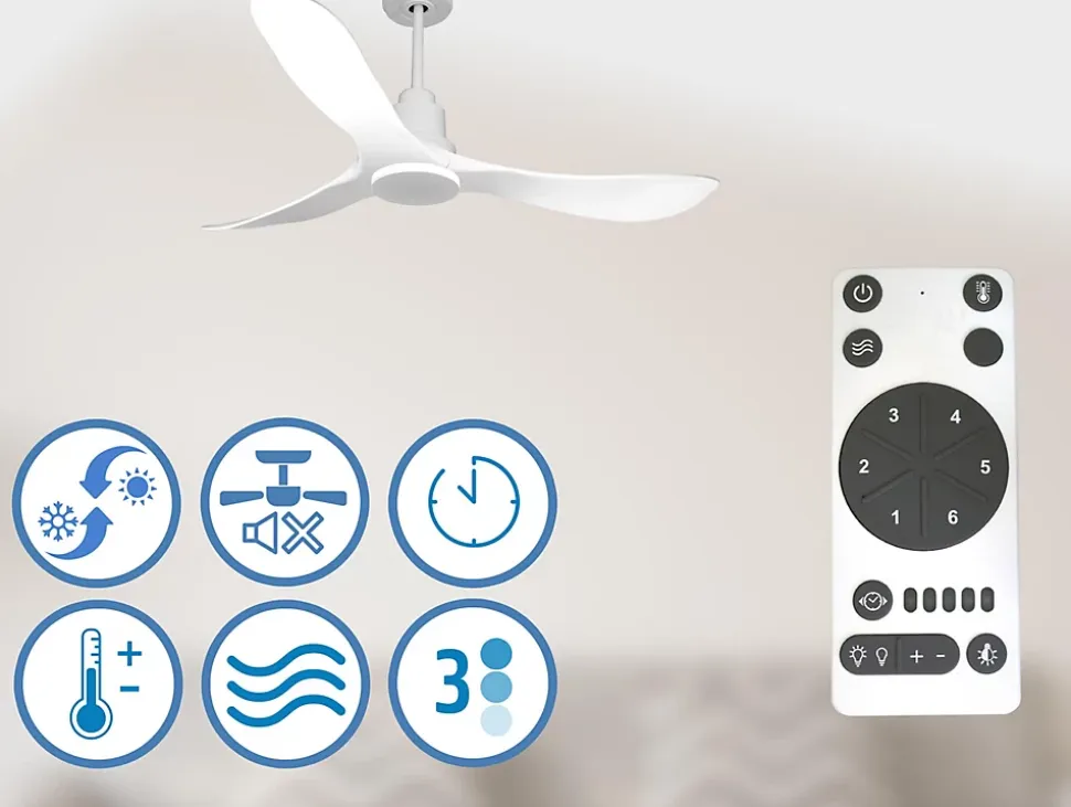 - Ventilateur de plafond connecté, usage via une application domotique possible (par exemple Tuya Smart), compatible iOS et Android