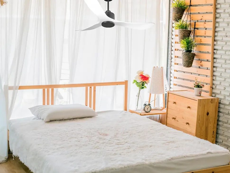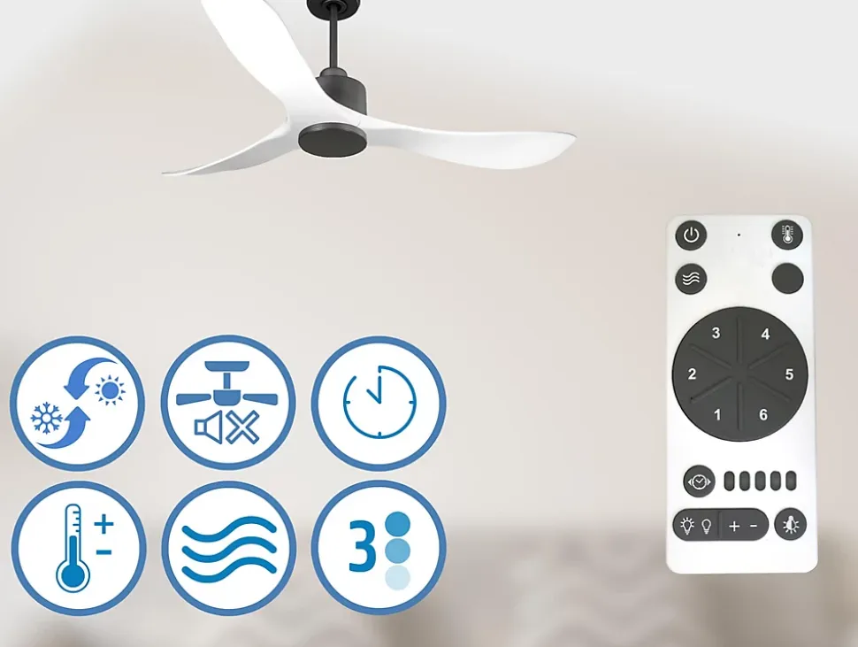 Ventilateur de plafond Réversible Thermostat Wifi Moteur à courant continu Toits en pente Télécommande Hypersilence Mémoire