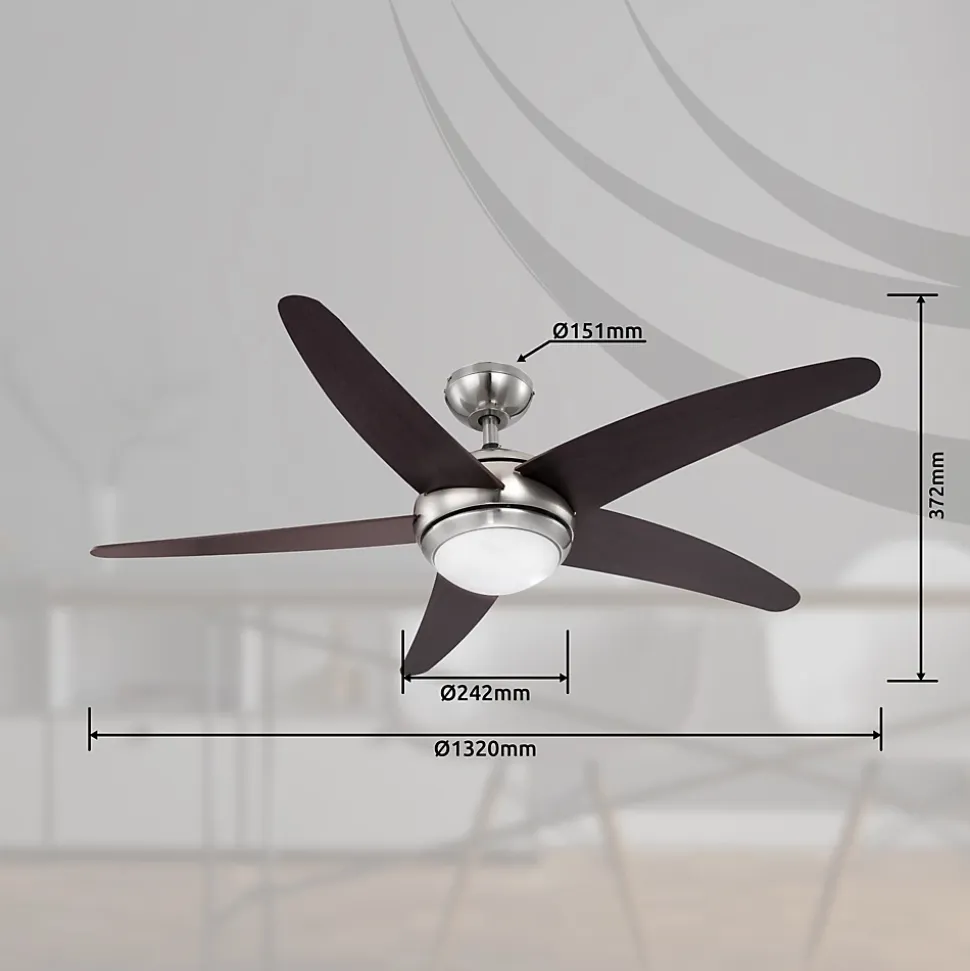 Ventilateur métal nickel mat, MDF wengé, verre opale, Télécommande, Batterie incluse 2x AAA, Puissance moteur maximale 55W, Utilisation optimale de l’espace 30m², Abkühlung, Aufheizen, Niveaux de vitesse 80/95/170 RPM, ø: 1320mm, H: 372mm, excl. 1x E14 60W 230V