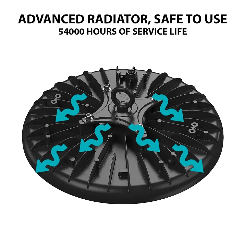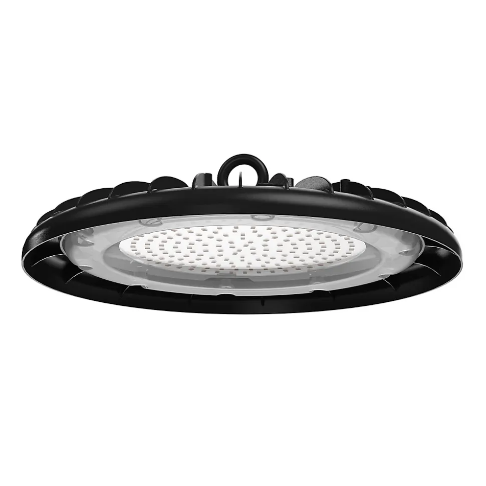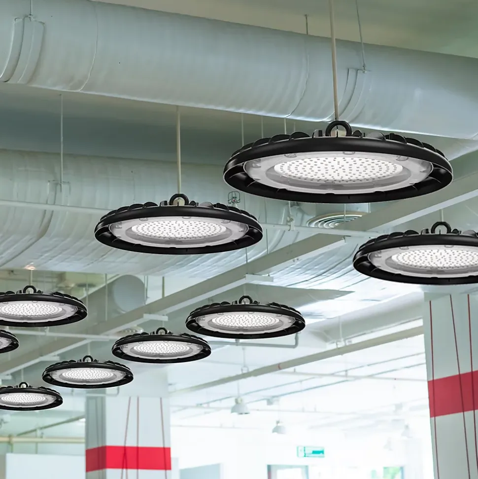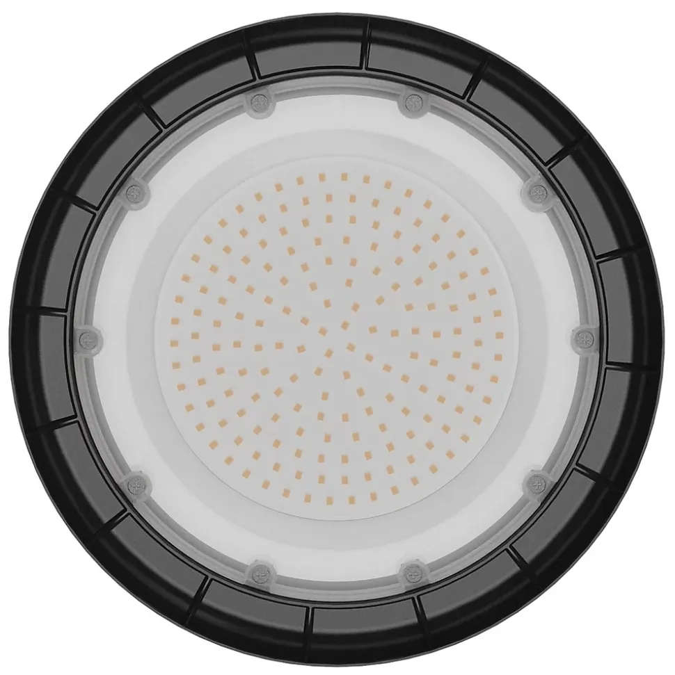 Économie d’énergie : les lampes industrielles Velamp LED utilisent des LED SMD de dernière génération avec une efficacité lumineuse de 100 lm/W, atteignant une efficacité énergétique E. Le remplacement des lampes halogènes traditionnelles (HQI) et des lampes à vapeur de mercure (HQL) peut économiser 70 à 80 % des coûts énergétiques avec la même puissance lumineuse. Technologie Driverless : La lampe Velamp HIGHBAY ne possède pas de driver mais une alimentation électronique (DOB) qui offre une excellente résistance aux pics de tension ainsi qu’une excellente fiabilité. Excellente dissipation de la chaleur : la lampe Velamp HIGHBAY est fabriquée en aluminium moulé sous pression de haute qualité, et l’ensemble de la lampe est un dissipateur de chaleur pour une dissipation plus efficace et plus rapide. Une bonne dissipation thermique peut protéger l’électronique de la lampe et garantir des performances stables et une durée de vie plus longue (durée de vie de 54 000 heures). Elle peut être installée partout : grâce à la protection IP65, la lampe HIGHBAY Velamp convient aux entrepôts, usines, garages, ateliers, supermarchés, centres logistiques, halls d’exposition, gymnases, quais, ports, cours, fermes, chantiers de construction… . Il s’installe facilement en quelques minutes : il suffit de brancher le câble fourni à l’alimentation électrique !