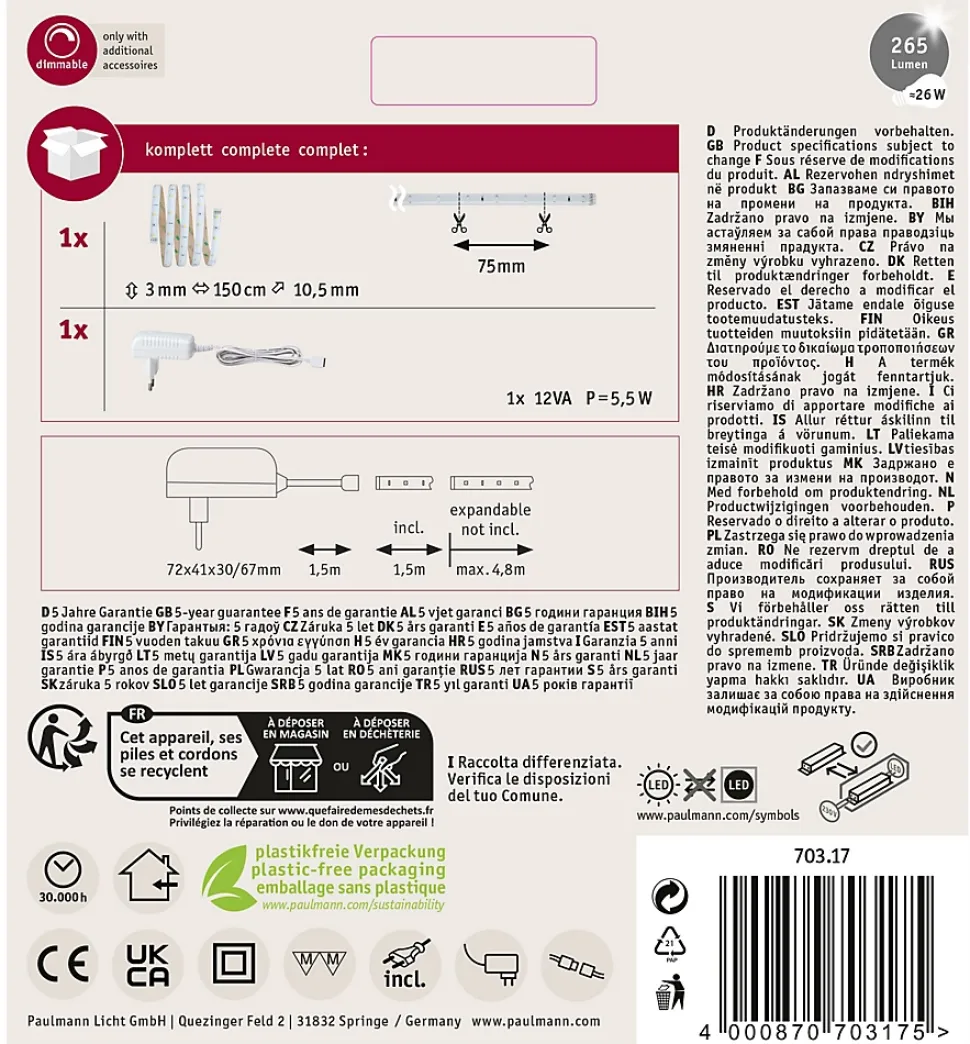 État du produit : l’article est techniquement irréprochable et a été entièrement contrôlé|Différence par rapport au produit neuf : défauts visuels sur l’emballage d’origine|Face arrière autocollante pour un montage simple|Peut être raccourci en fonction de la longueur souhaitée (aux endroits marqués)|Éclairage LED d’un blanc chaud agréable|Revêtement transparent pour protéger la LED des contacts ou de l’humidité|Matériel flexible pour le montage sur des surfaces planes ou courbes|Technologie LED basse consommation (fait économiser jusqu’à 80 % par rapport aux ampoules à incandescence classiques)|Protection optionnelle contre les projections d’eau au moyen de l’article 70247|Kit prêt à fonctionner fourni avec alimentation 230/12V, câble d’alimentation et fiche secteur|Inclus le connecteur à 4 broches pour une connexion simple au ruban|Remarque : nos produits de grade B ne peuvent pas bénéficier des codes de réduction sélectionnés.|Einfaches Stecksystem zur problemlosen Montage