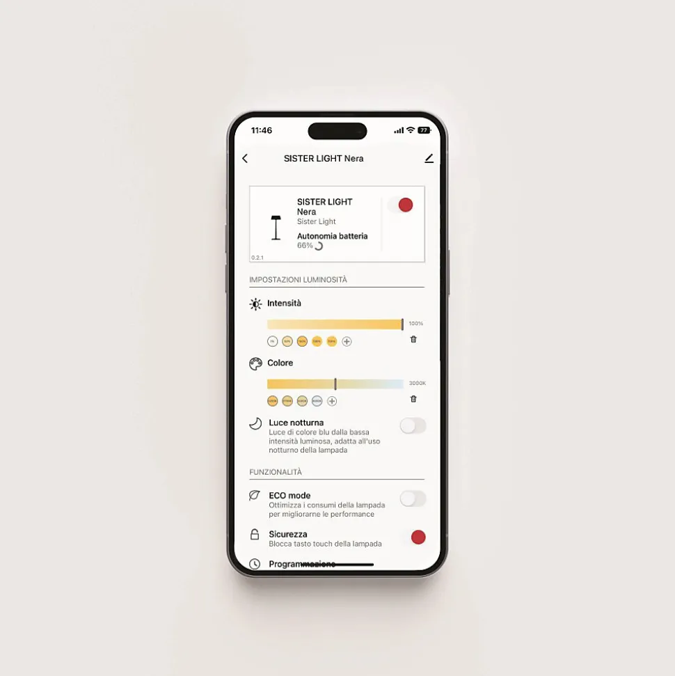 DONNÉES TECHNIQUESGRADATEUR TACTILE LED2200-2700-3000-4000K | IRC > 90250-275-296-338 ml | 3,2W | IP655 Vcc maximum 2ACorps en aluminium anodisé brossé ou peint et diffuseur prismatique en polycarbonate. Convient pour un usage externe (lampe IP65) et interne (lampe sur socle de chargement IP20).Résistance aux chocs (IK07) et au brouillard salin (1500h). Durée 8 – 58 h, en fonction du réglage du flux lumineux et des paramètres Wi-Fi. Temps de charge à 2A : 5 hBatterie au lithium rechargeable et remplaçable AVERTISSEMENTS Pour fonctionner, la lampe doit être connectée à un réseau Wi-Fi 2,4 GHz. Le micrologiciel de l’appareil peut être mis à jour à distance.Dans le colis vous trouverez : le piquet Wi-fi SISTER LIGHT, la base de chargement par contact et 2 tiges pour allonger le corps de votre lampe.Sister Light Wi-fi est une lampe design idéale pour une utilisation dans les espaces extérieurs, les tonnelles, les bars, les restaurants et les espaces de détente, elle est également largement utilisée dans les chambres, les salons et les bureaux professionnels. Lampe de table LED design également adaptée à une utilisation en extérieurDimension : Ø13,2xH9,8cm