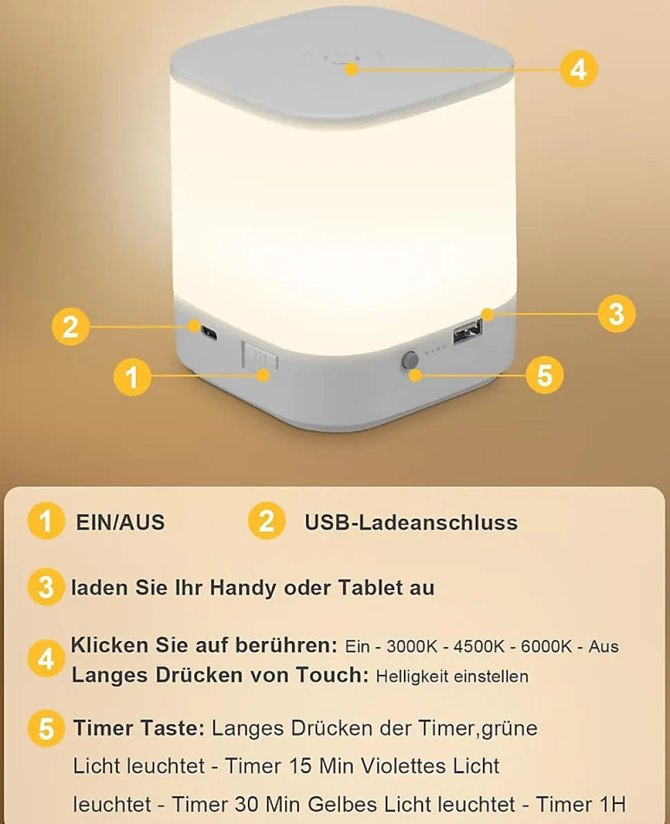 Lampe de chevet multifonctionnelle : la lampe de chevet led est dotée d’une gradation tactile et de 3 températures de couleur (3000k-4500k-6000k) pour trouver l’ambiance lumineuse la plus agréable selon votre humeur et répondre facilement à vos besoins de détente quotidienne, de sommeil et de soins nocturnes. Source de lumière douce : la lampe de table sans fil a une lumière douce et agréable, est 100 % sans scintillement, protège les yeux des enfants et des personnes âgées et est idéale pour l’éclairage nocturne. Fonction minuterie : appuyez longuement sur le bouton de minuterie de la lampe de chevet alimentée par batterie pour régler la veilleuse pour enfants afin qu’elle s’éteigne automatiquement après 15 min/30 min/1 h. C’est le choix idéal pour les soins de bébé, dormir dans la chambre d’enfant et le camping en plein air. Autonomie de la batterie extra longue : la lampe de chevet à intensité variable dispose d’une batterie au lithium intégrée de 1 800 mah, qui peut être complètement chargée en seulement 3 heures et dure jusqu’à 17 à 80 heures, dites adieu aux tracas des charges fréquentes. De plus, la lampe tactile est équipée d’un port de chargement usb pour permettre le chargement des téléphones portables et des tablettes. Cadeau idéal : la lampe de table led est un cadeau parfait pour les amis et la famille, parfaite pour créer une atmosphère relaxante dans la chambre, la chambre de bébé, le bureau et le camping, même pendant le yoga, au restaurant ou lors d’un pique-nique en plein air.