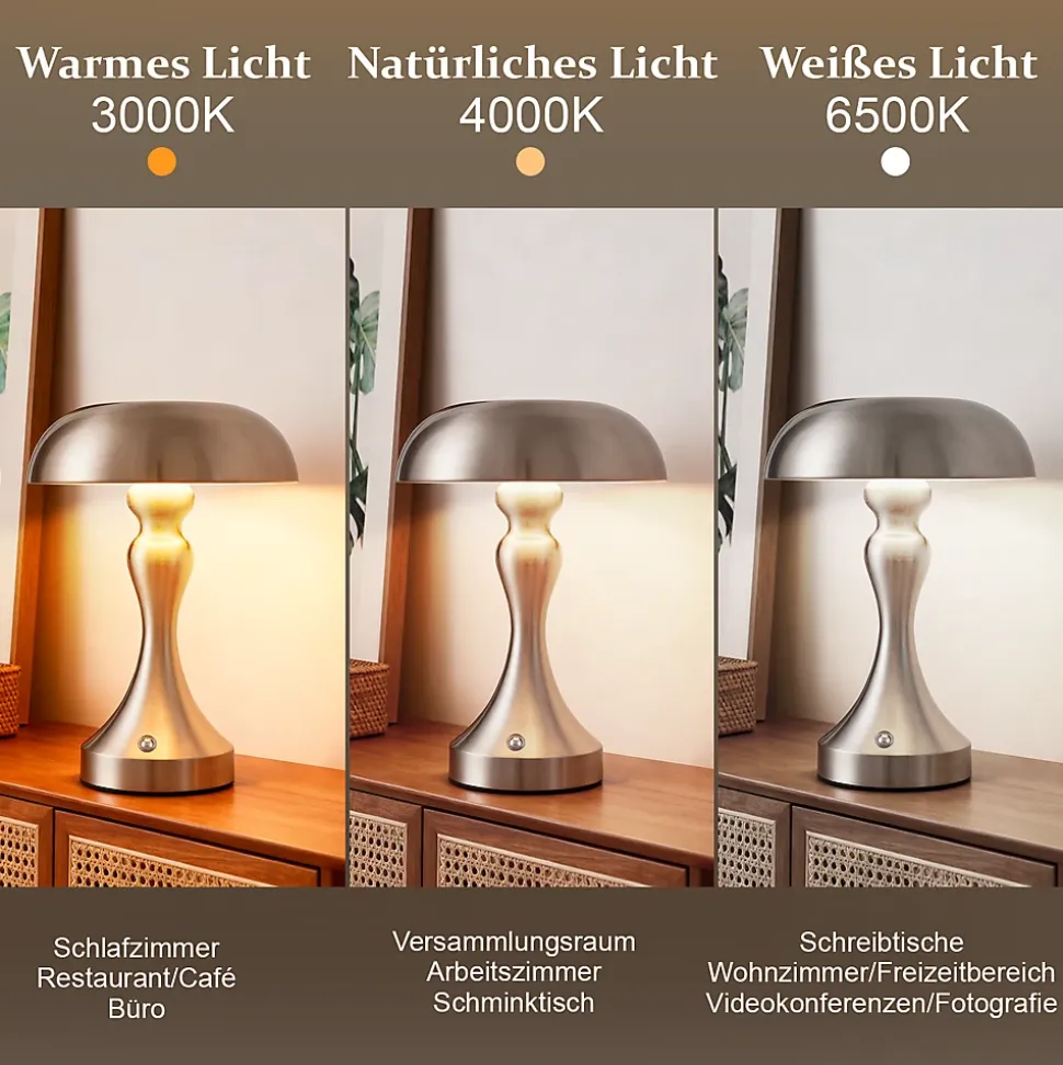 Lampe tactile à intensité variable : la lampe de table led tactile à intensité variable est très facile et intuitive à utiliser. Une légère pression suffit pour régler la lumière selon vos besoins. La lampe de table dispose de 3 niveaux de luminosité. Appuyez brièvement pour régler la couleur de la lumière (3 000-6 500 k) ; appuyez longuement pour régler la luminosité (0-100 %). Mobile et rechargeable : la lampe à batterie rechargeable peut être utilisée de deux manières. Elle peut être ouverte et utilisée pendant la charge. Une fois la lampe à batterie complètement chargée, vous pouvez la débrancher du port usb et l’utiliser n’importe où dans la maison. Très flexible et confortable, elle peut également servir d’éclairage de secours en cas d’urgence. Lampe de chevet led efficace : la lampe de table led sans fil à batterie est dotée d’une batterie au lithium intégrée de 1 800 mah, qui peut fonctionner pendant 6 heures après une charge complète (selon la luminosité de fonctionnement). La lampe de table est équipée d’un câble de charge usb de type c. Une charge complète ne prend que 3 heures, vous permettant d’utiliser cette lampe de table sans souci. Nombreuses applications : cette lampe champignon à piles trouve sa place dans une chambre, un salon, une salle à manger, un bureau, mais aussi dans un bar ou une salle de réception. Son design rétro sublime l’atmosphère tout en créant un style unique. Design portable classique : ces lampes de table présentent un design simple et élégant. Leur hauteur de 22 cm s’adapte à toutes les tables, armoires et bars. Disponible en trois coloris : nickel, bronze rouge et bronze doré, cette lampe de table vous permet d’ajouter différents styles à votre intérieur.