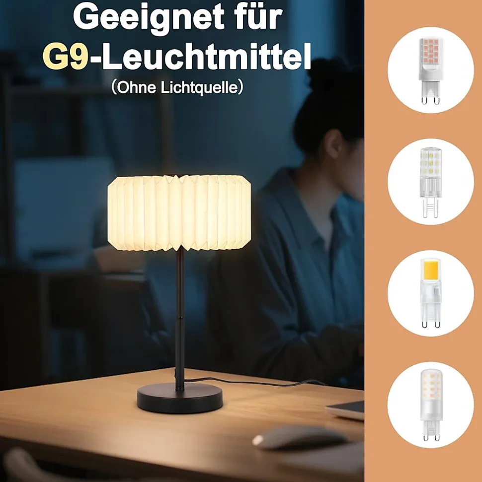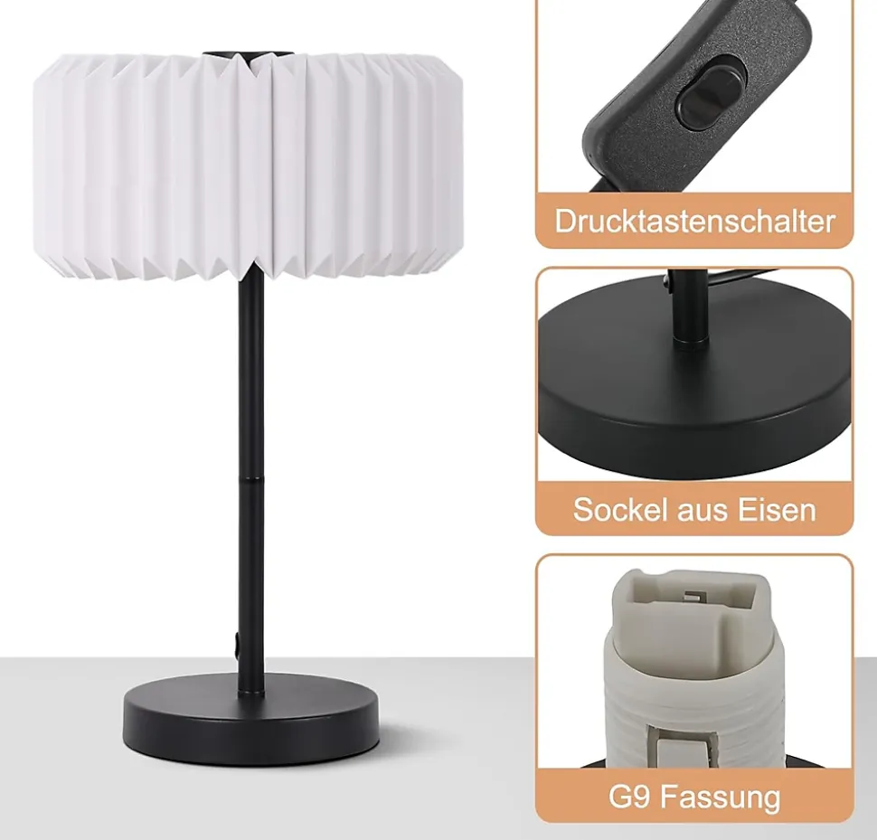 Design vintage : cette lampe de table se distingue par un abat-jour en origami unique et une innovation en papier, conférant à l’ensemble un design haut de gamme et un style décoratif original pour votre chambre.matériaux premium : l’abat-jour est fabriqué en papier pliable de haute qualité, résistant aux chocs et durable. Le socle en métal, associé à une tige élancée et une base circulaire, assure une stabilité optimale. Le revêtement noir protège contre la rouille et la corrosion.compatibilité : puissance maximale de 40 w, tension d’entrée 220-240 v ca, compatible avec les ampoules g9 (non incluse – à choisir selon vos préférences).lumière douce : l’abat-jour en origami diffuse une lumière chaude et tamisée, idéale pour créer une atmosphère cosy et protéger les yeux lors de la lecture nocturne.polyvalence d’usage : parfaite pour le chevet, le bureau, le salon ou les espaces commerciaux (hôtels, cafés, etc.). Compacte et portable, elle s’adapte à toutes les pièces : chambre d’enfant, salle de maquillage, résidence senior… un design élégant pour répondre à tous vos besoins de décoration.
