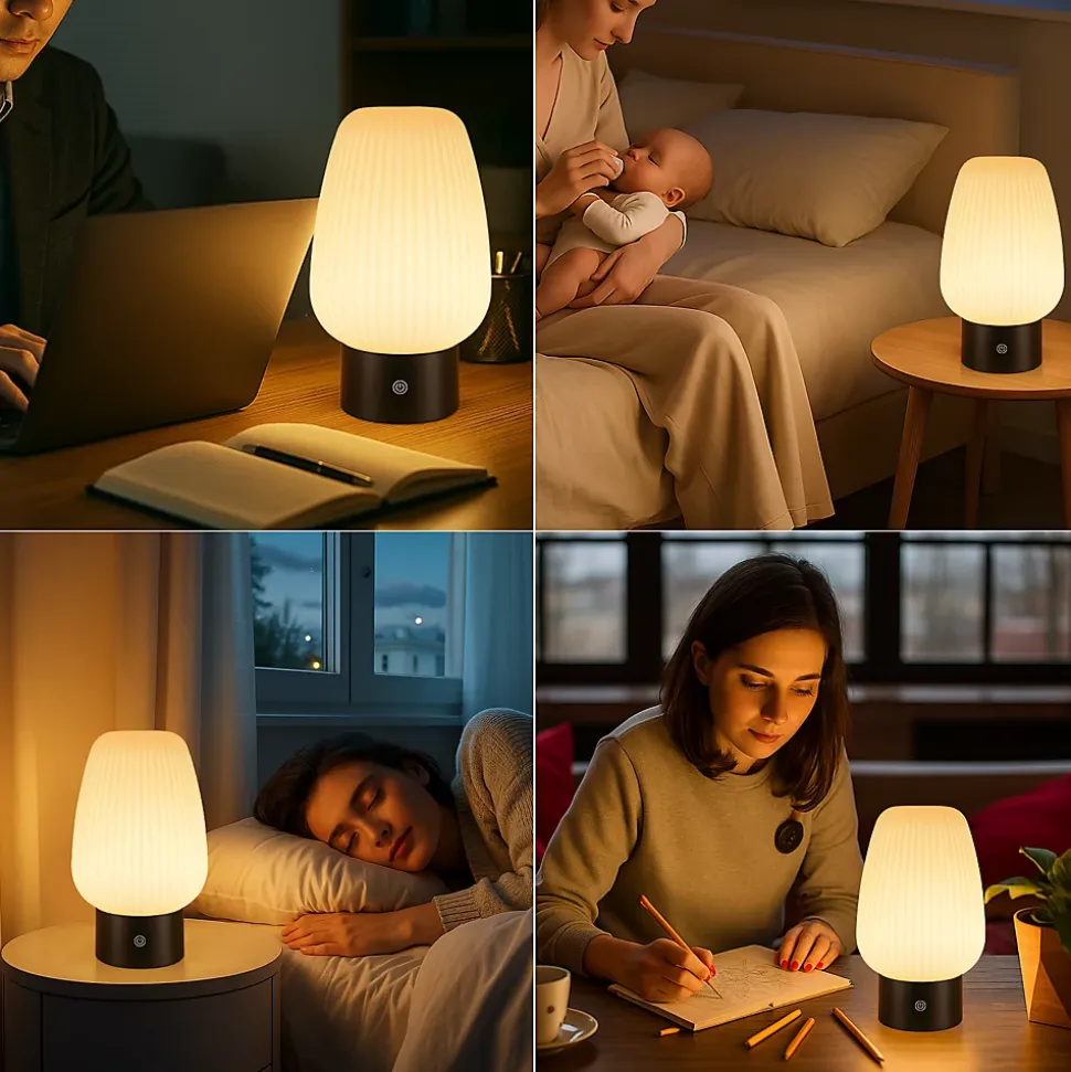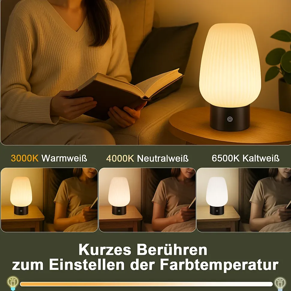 haute qualité, durable et translucide : le boîtier extérieur de cette lampe de table est en verre, la membrane intérieure en polycarbonate et le socle en abs. Elle assure une transmission lumineuse optimale et résiste à la chaleur et à l’abrasion. tous les matériaux sont conformes aux normes de sécurité, inodores et non toxiques. trois températures de couleur avec variation tactile : cette lampe de chevet offre trois températures de couleur réglables (blanc chaud 3000 k, blanc neutre 4000 k et blanc froid 6500 k) avec une variation d’intensité progressive de 10 % à 100 %. Vous pouvez ainsi adapter la luminosité à vos besoins, que ce soit pour lire, travailler ou vous détendre. Une simple pression prolongée permet de régler la luminosité ; une brève pression permet de changer la température de couleur. Son utilisation est simple et intuitive, sans boutons complexes.sans fil et avec une autonomie exceptionnelle : cette lampe de table led est équipée d’une batterie de 1800 mah. Une charge de 4 heures (entrée 5 v 1 a) offre 5 heures d’autonomie. Sans fil, elle vous permet une totale liberté de mouvement, de la chambre au balcon en passant par la salle de bain, sans être gênée par les prises électriques.étanchéité ip44 : cette lampe est étanche (ip44) et résiste aux projections d’eau de toutes directions. Elle est idéale pour les salles de bain, les cuisines ou les terrasses. L’humidité ne la gêne pas ; elle est parfaitement adaptée aux environnements humides.compacte et portable : dimensions : 21 x 13 x 8,7 cm. Petite et légère, elle se glisse facilement dans la pièce. Son design vertical noir et blanc s’harmonise avec différents styles d’intérieur, du minimaliste au moderne en passant par le classique.