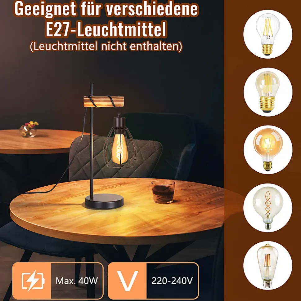 klassischer industrie-retro-stil: die tischlampe ist aus ausgewähltem massivholz gefertigt, das durch beflammen behandelt wurde und eine natürliche und einzigartige oberflächenstruktur aufweist, mit einem schwarzen metall-lampenschirm, der einen reinen industriellen retro-stil unterstreicht. Fusion von natürlichen und industriellen elementen, sowohl als beleuchtung werkzeug, sondern auch stil dekoration, das hinzufügen einer einzigartigen textur in den raumkompatibel mit e27-lichtquellen: die tischleuchte aus holz ist mit einer standard-e27-lampenfassung ausgestattet, die für eine vielzahl von lichtquellen (bis zu 40 w) geeignet ist, so dass der benutzer je nach szene warmes oder weißes licht wählen kann. das leuchtmittel ist nicht im lieferumfang enthalten, so dass sie mehr spielraum für eine unabhängige wahl habenstabiler basis: die schwarze tischlampe ist mit einem beschwerten metallsockel ausgestattet, um sicherzustellen, dass die tischleuchte stabil steht und nicht leicht umkippt. Sie kann auf einer vielzahl von flachen oberflächen wie schreibtischen, nachttischen, beistelltischen usw. Platziert werden, was für mehr sicherheit im täglichen gebrauch sorgteinfache bedienung: größe: lampenfuß: 15*2,5cm; lampenschirm: 14*14,7cm; höhe: 46cm. Die nachttischlampe wird mit einem verlängerten netzkabel und einem schalter geliefert, einstecken und benutzen. Einfach zu installieren, einfach zu starten, geeignet für alle benutzer, problemlos und effizientmehrere einsatzmöglichkeiten: ob als nachttischlampe im schlafzimmer, als leselampe im arbeitszimmer oder als dekorative lampe im wohnzimmer, diese tischlampe lässt sich leicht in verschiedene wohnstile integrieren und schafft eine warme und gemütliche atmosphäre