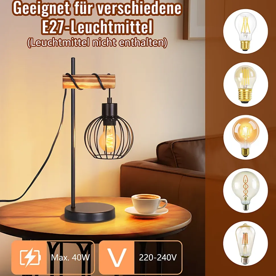 klassischer industrie-retro-stil: die tischlampe ist aus ausgewähltem massivholz gefertigt, das durch beflammen behandelt wurde und eine natürliche und einzigartige oberflächenstruktur aufweist, mit einem schwarzen metall-lampenschirm, der einen reinen industriellen retro-stil unterstreicht. Fusion von natürlichen und industriellen elementen, sowohl als beleuchtung werkzeug, sondern auch stil dekoration, das hinzufügen einer einzigartigen textur in den raumkompatibel mit e27-lichtquellen: die tischleuchte aus holz ist mit einer standard-e27-lampenfassung ausgestattet, die für eine vielzahl von lichtquellen (bis zu 40 w) geeignet ist, so dass der benutzer je nach szene warmes oder weißes licht wählen kann. das leuchtmittel ist nicht im lieferumfang enthalten, so dass sie mehr spielraum für eine unabhängige wahl habenstabiler basis: die schwarze tischlampe ist mit einem beschwerten metallsockel ausgestattet, um sicherzustellen, dass die tischleuchte stabil steht und nicht leicht umkippt. Sie kann auf einer vielzahl von flachen oberflächen wie schreibtischen, nachttischen, beistelltischen usw. Platziert werden, was für mehr sicherheit im täglichen gebrauch sorgteinfache bedienung: größe: lampenfuß: 15*2,5cm; lampenschirm: 14*14,7cm; höhe: 47cm. Die nachttischlampe wird mit einem verlängerten netzkabel und einem schalter geliefert, einstecken und benutzen. Einfach zu installieren, einfach zu starten, geeignet für alle benutzer, problemlos und effizientmehrere einsatzmöglichkeiten: ob als nachttischlampe im schlafzimmer, als leselampe im arbeitszimmer oder als dekorative lampe im wohnzimmer, diese tischlampe lässt sich leicht in verschiedene wohnstile integrieren und schafft eine warme und gemütliche atmosphäre