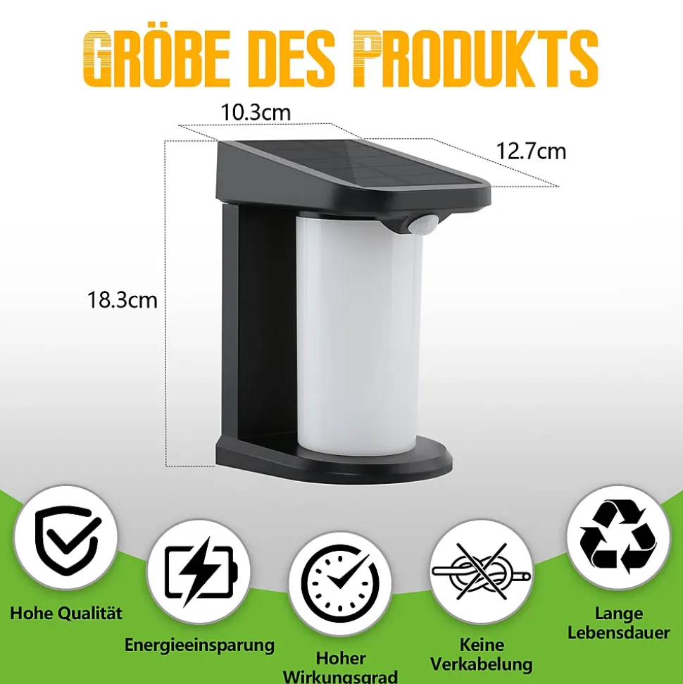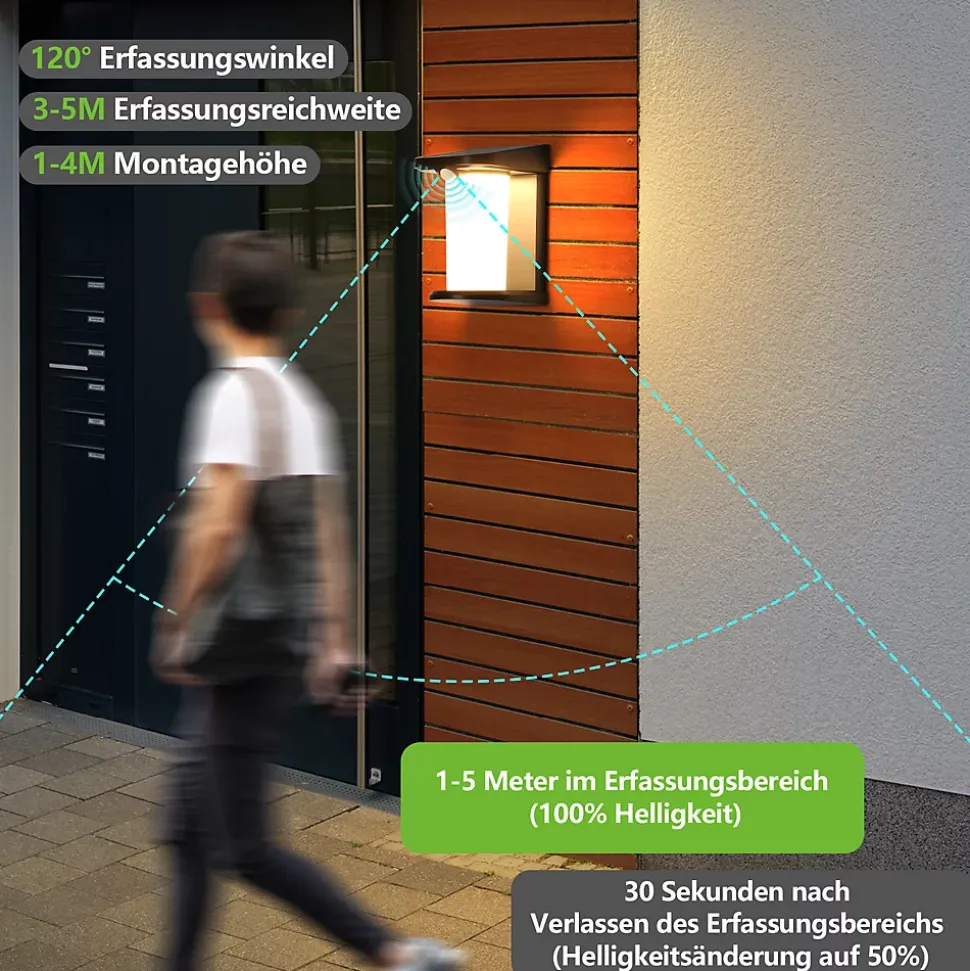 économie d’énergie ultime:les lampes solaires extérieures utilisent des cellules solaires en silicium monocristallin pour convertir l’énergie solaire en électricité,avec une sensibilité à la lumière plus élevée et un taux de conversion de l’énergie solaire allant jusqu’à 24%.haute efficacité:les modules solaires en silicium monocristallin se chargent plus rapidement que les modules solaires ordinaires et peuvent stocker suffisamment d’électricité même lorsque le soleil ne suffit pas (temps nuageux et pluvieux) pour une charge rapide. Boîtier en abs, résistant aux hautes températures et anti-vieillissement, garantissant une utilisation prolongée en extérieur,peut être utilisé de -25°c en hiver à 45°c en été.2 modes d’éclairage:la lumière solaire avec détecteur de mouvement peut détecter dans un angle de 120° et une portée de 3-5 mètres.1. Modemouvement+lumière tamisée »:contrôle intelligent de la luminosité,lorsqu’un mouvement est détecté,la lumière passe de 50% à 100% de luminosité,et 30 secondes après le mouvement,elle revient automatiquement à 50% de luminosité;2.Mode « luminosité constante »: la lumière s’allume automatiquement la nuit et reste allumée toute la nuit.capteur de lumière:lumière chaude 3000k avec une portée de 3-5 mètres.La lampe murale a un capteur de lumière intégré,allume automatiquement la lumière la nuit et l’éteint à l’aube.Charge automatique pendant 5-6 heures durant la journée,batterie haute efficacité de 1800mah complètement chargée,peut alimenter la lumière toute la nuit (8-12 heures).installation facile:lampe led solaire avec détecteur de mouvement facile à installer,il suffit de fixer la lampe led solaire au mur avec les vis fournies,aucun câblage nécessaire,arrière-cour,balcon,deck,clôture,fait en 3 minutes.Remarque:veuillez orienter le panneau solaire vers le soleil pour une meilleure charge.La hauteur d’installation recommandée est d’environ 3-5m. »