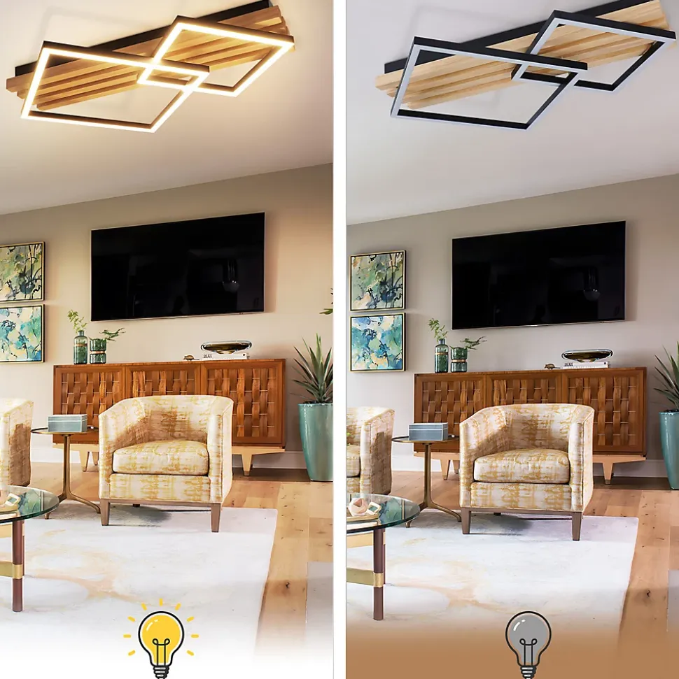 Design géométrique simple : ce luminaire de salon led moderne est composé d’une base en bois et d’une base en fer noir. Des matériaux de haute qualité et durables garantissent longévité et durabilité.Plafonnier basse consommation : le plafonnier en bois gbly a une puissance de 36 w et un diamètre de lampe de 55 cm. Il diffuse une lumière ultra-lumineuse et couvre une surface de 15 à 30 m2. Comparé aux lampes classiques, il vous permet d’économiser plus de 90 % sur vos factures d’énergie.Variation d’intensité : le plafonnier de chambre gbly est télécommandé. La température de couleur est réglable entre 3 000 k et 6 500 k. La luminosité est réglable entre 10 % et 100 %, vous permettant d’ajuster la lumière selon vos besoins. La fonction mémoire enregistre les réglages effectués depuis la dernière extinction.Agréable pour les yeux, sans scintillement : ce plafonnier led moderne en bois est résistant aux interférences haute fréquence. Grâce à l’abat-jour en matériau de haute qualité, la lumière est vive et uniforme, sans scintillement ni éblouissement. L’indice de rendu des couleurs du plafonnier led est supérieur à 80, offrant une reproduction claire et éclatante des couleurs.