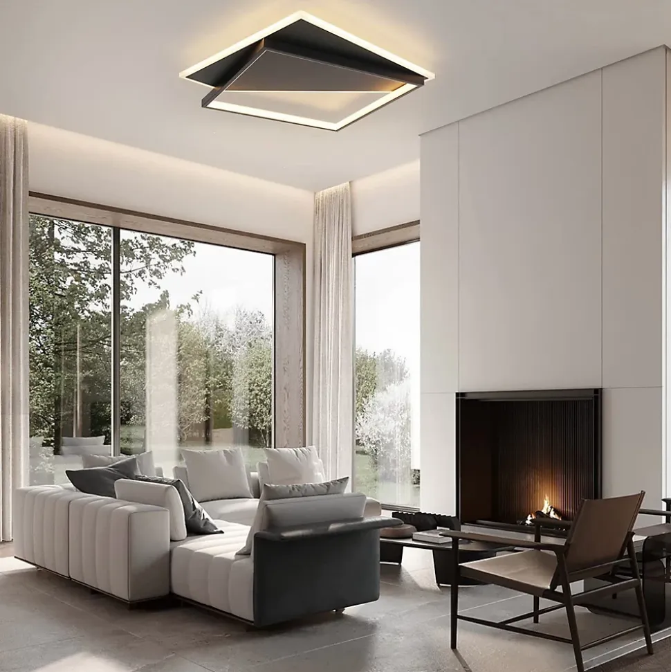 Design moderne avec motifs carrés, dimmable avec télécommande, corps en fer et acrylique, polyvalent pour divers espaces.