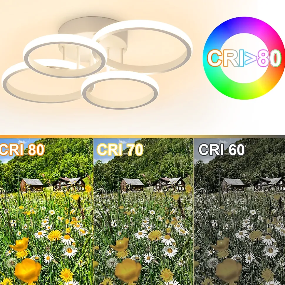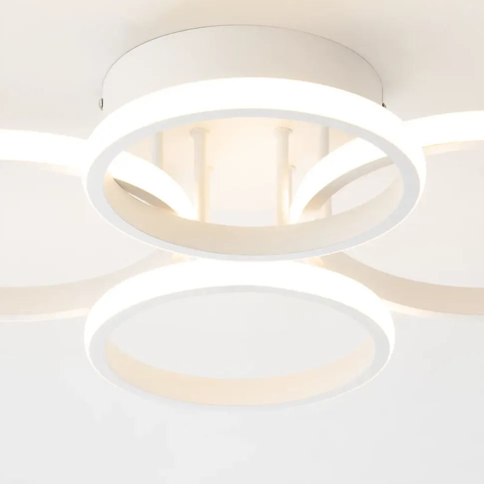 design moderne et matériaux de haute qualité : ce plafonnier à 4 anneaux combine l’aluminium, le fer et le silicone pour créer un design élégant et durable qui s’intègre parfaitement dans les salons et les chambres modernes.technologie led économe en énergie : avec une puissance led de 48 w, ce plafonnier offre un éclairage lumineux et économe en énergie qui illumine de manière optimale vos pièces.installation facile et dimensions compactes : avec une taille de 54,6 x 42,6 x 11,8 cm (lumière) et 28 x 28 x 10 cm (emballage), ce plafonnier est facile à installer et s’adapte même dans les petites pièces.dimmable et télécommande : la lampe est dimmable et est livrée avec une télécommande pratique pour que vous puissiez facilement régler la luminosité selon vos besoins.utilisations polyvalentes : que ce soit dans le salon, la chambre ou d’autres pièces, ce plafonnier moderne s’intègre parfaitement dans différents styles d’intérieur et crée une atmosphère chaleureuse.