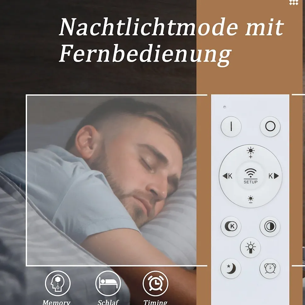 Design géométrique & minimaliste, Protection des yeux et pas de scintillement, Dimmable-Ce plafonnier LED au design moderne est équipé d’une télécommande qui peut commuter entre lumière chaude, lumière naturelle et lumière froide ; la télécommande vous permet de régler facilement la luminosité de 10 % à 100 % et la température de couleur de 3000K à 6500K, Fonctions de sommeil et de minutageCe plafonnier dispose de fonctions de sommeil et de minutage. Lorsque l’on s’endort la nuit, la lumière peut s’atténuer progressivement et devenir douce. Parallèlement, les utilisateurs peuvent régler le plafonnier pour qu’il s’éteigne automatiquement après un certain temps afin d’éviter les perturbations de la qualité du sommeil dues à un éclairage prolongé, Scènes polyvalentesCe plafonnier au design moderne est adapté à un large éventail de scènes, idéal pour le salon, la cuisine, la chambre à coucher, la salle à manger, le couloir et l’éclairage du balcon, rendant toute la pièce plus lumineuse et confortable.