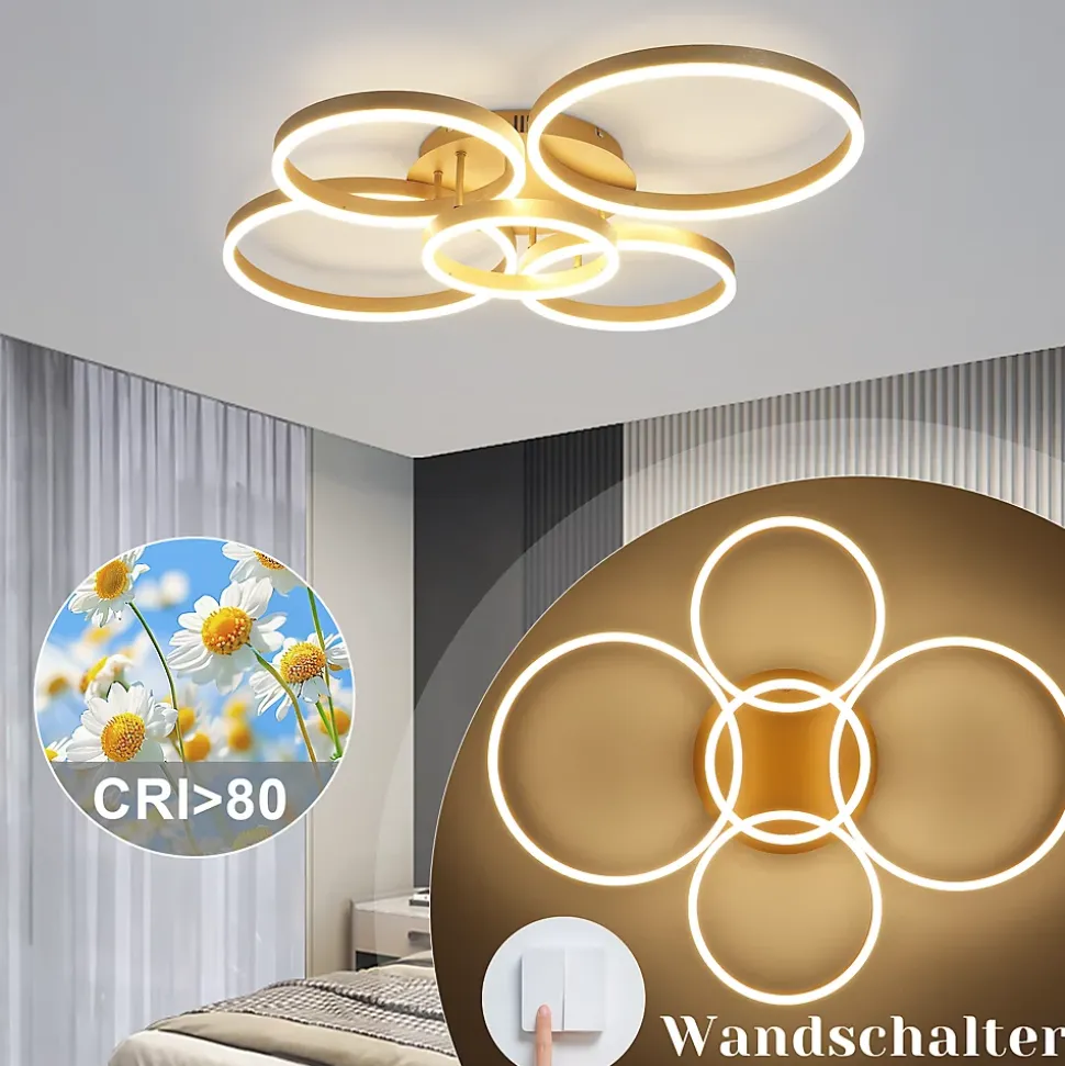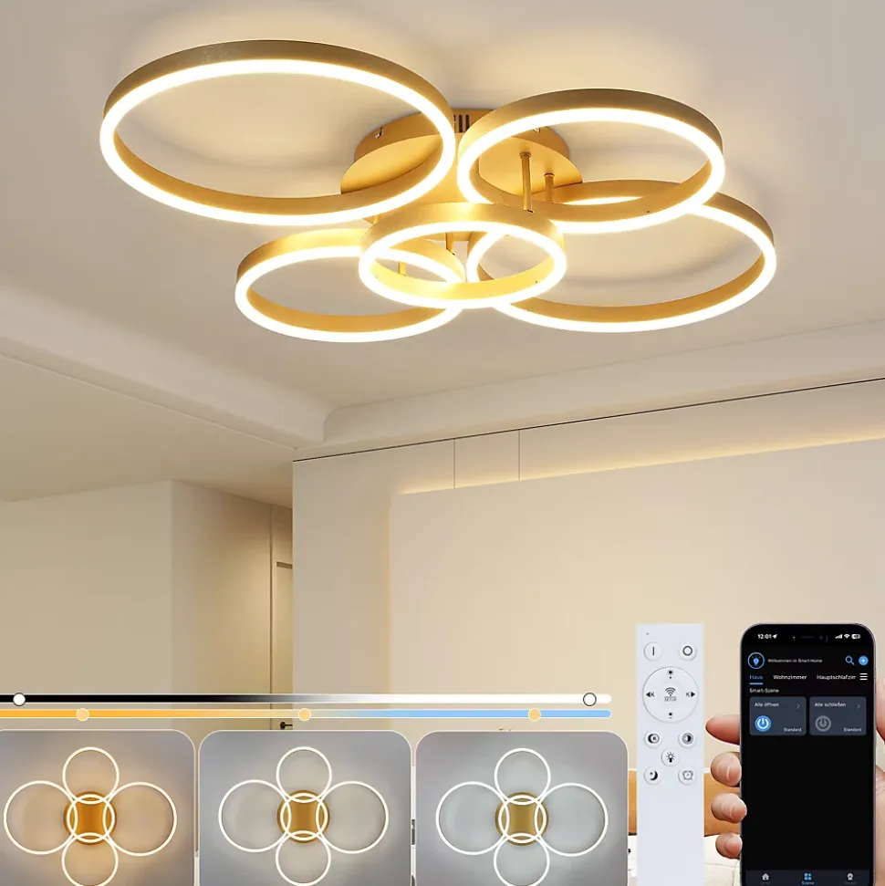 design moderne : le plafonnier se compose de cinq anneaux et d’un acrylique rond, créant une atmosphère élégante et artistique pour votre maison. luminosité : ce plafonnier dispose de cinq sources lumineuses avec une luminosité totale de 7200 lumens, offrant un éclairage lumineux et agréable. température de couleur réglable : le lustre offre une température de couleur de 3000k-6500k, vous permettant d’ajuster le blanc chaud, le blanc neutre et le blanc froid en fonction de votre scénario d’utilisation et de votre humeur. télécommande infrarouge : avec la télécommande incluse, vous pouvez facilement contrôler la luminosité et la température de couleur, profitant ainsi d’une vie plus confortable. installation facile : avec une taille de 940 mm x 750 mm, le lustre convient à de nombreuses pièces, telles que le salon, la chambre, le bureau ou le bureau, et est facile à installer.