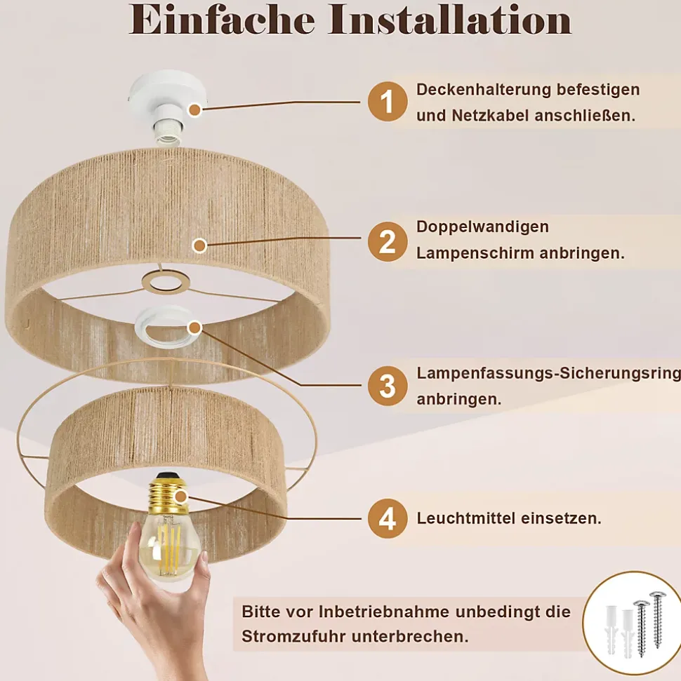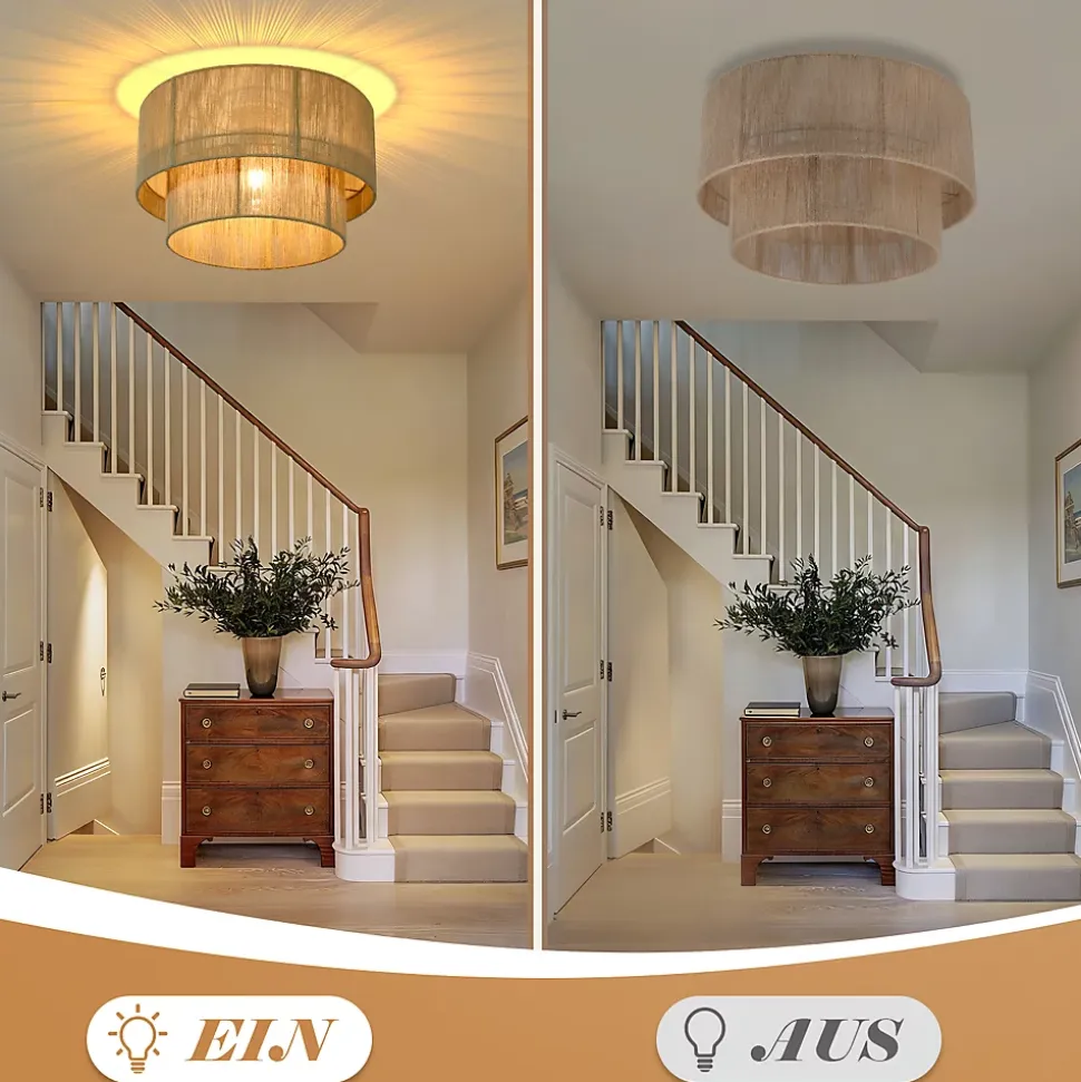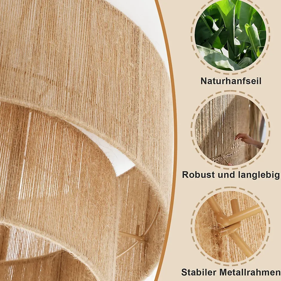 ✔design d’inspiration bohème : ce plafonnier de salon s’inspire de l’esthétique bohème et dégage une élégance artistique unique. Son abat-jour raffiné en corde de jute double épaisseur est confectionné selon des techniques de tissage naturelles, laissant filtrer la lumière et créant une douce lueur chaleureuse. Il favorise ainsi une atmosphère de liberté et de spontanéité.✔matériau naturel : l’abat-jour est tissé en corde de jute naturelle, un matériau résistant à la corrosion et à la casse, dont la texture naturelle lui confère un charme rustique. L’alliance de la structure métallique et du jute préserve le charme inimitable du style bohème tout en renforçant la durabilité et la stabilité de la lampe.✔caractéristiques techniques : abat-jour intérieur : 30 cm × 9 cm ; abat-jour extérieur : 40 cm × 16 cm ; douille : e27 ; puissance : 40 w maximum (ampoule non fournie) ; matériaux : métal et corde de chanvre. Tension : 220–240 v✔installation facile : ce plafonnier de 40 cm de diamètre est équipé d’une douille e27 standard, compatible avec diverses ampoules (ampoule non fournie). Sa conception simple permet une installation au plafond aisée, même pour les installateurs novices, et apporte une touche d’élégance à votre intérieur.✔utilisation polyvalente : ce plafonnier rustique est idéal pour les salons, salles à manger, chambres, cuisines et même les couloirs. Sa lumière chaude crée une ambiance chaleureuse, tandis que son design épuré et élégant s’intègre harmonieusement à la décoration de n’importe quelle pièce.