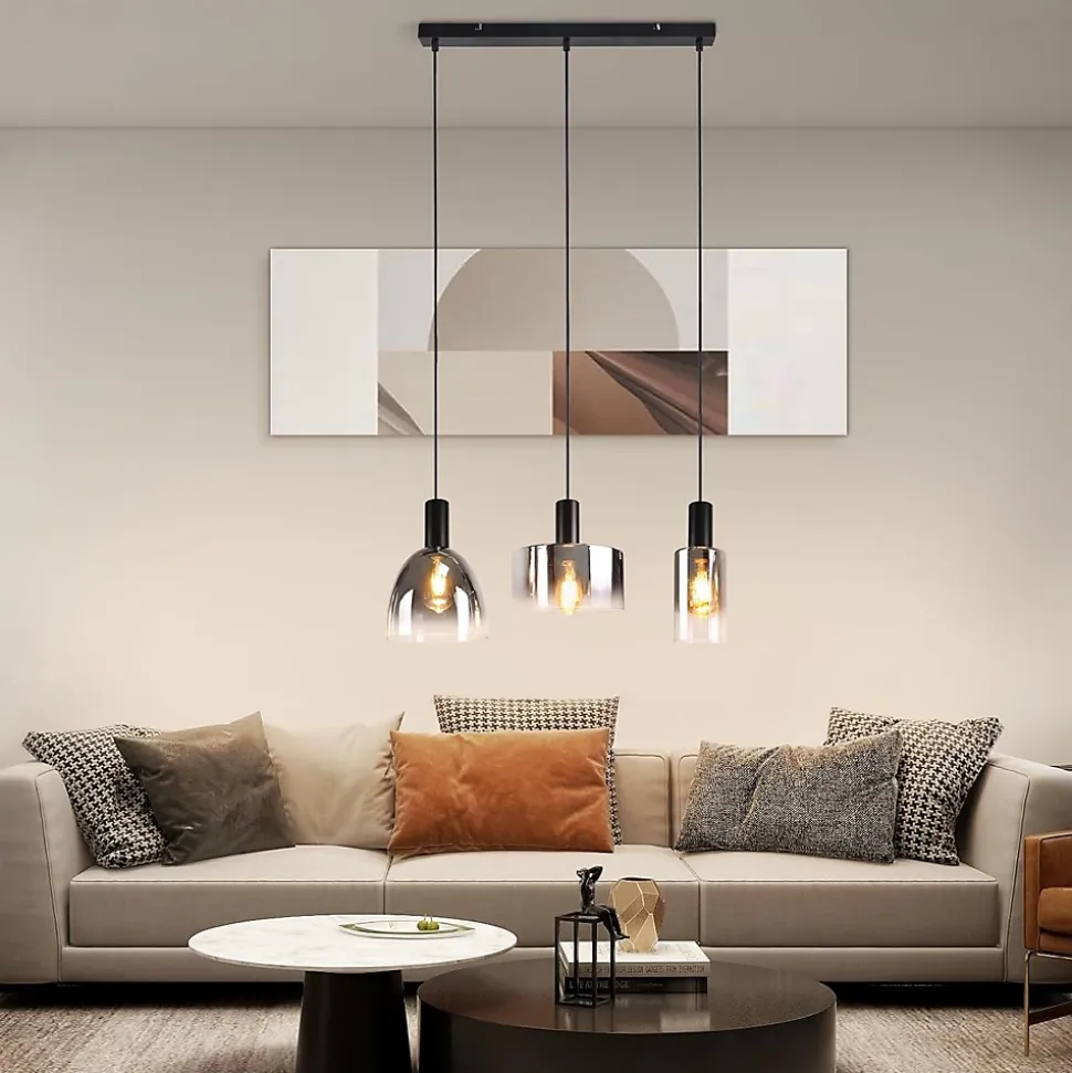 [Design unique] Cette suspension en verre pour table à manger est dotée d’une structure métallique robuste et d’un abat-jour en verre de haute qualité, garantissant solidité et durabilité. Les abat-jour se déclinent en différentes formes pour s’harmoniser avec divers styles de décoration intérieure, créant une ambiance luxueuse et harmonieuse. L’abat-jour du lustre est réalisé en verre noir mat et gris anthracite avec un effet dégradé qui diffuse la lumière de manière plus homogène, apportant profondeur et relief à la pièce.[Dimensions et matériaux] Les dimensions des abat-jour en verre (de gauche à droite) sont : 25 x 25 x 12 cm, 20 x 20 x 18 cm et 10 x 10 x 18 cm. La structure métallique de la rosace mesure 55 x 5 x 2,5 cm. Le câble de suspension mesure 150 cm de long. Ce lustre de restaurant est fabriqué en fer et en verre de haute qualité, ce qui le rend résistant à la rouille, facile à installer et à nettoyer.[Douille E27 et hauteur réglable] Cette suspension pour salon est équipée de trois douilles E27 (ampoules non incluses). Elle est compatible avec différentes ampoules E27, vous permettant ainsi de personnaliser votre luminaire. La puissance maximale de l’ampoule est de 25 W et la tension d’alimentation est de 230 V. Le câble réglable mesure 150 cm de long, vous permettant d’ajuster la hauteur de la suspension.[Installation facile] Cette suspension est livrée avec une notice d’installation détaillée et tous les accessoires nécessaires. Son installation est simple et ne nécessite aucun outil professionnel. La surface en verre est lisse et facile à nettoyer, ce qui réduit l’entretien.[Utilisation polyvalente] Cette suspension en verre dégradé convient aux chambres, salons, cuisines, salles à manger, couloirs, cafés, bureaux, hôtels et autres espaces. C’est un luminaire fonctionnel idéal.Caractéristiques et avantages