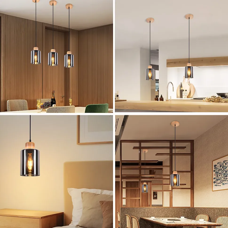 L’élégance naturelle grâce à un mélange de matériaux : la suspension en bois et en verre gris fumé combine deux matériaux de haute qualité pour créer un design naturellement élégant. Les matériaux robustes et la fabrication solide promettent une longue durée de vie. Réglage de la hauteur pour une flexibilité maximale : la lampe est réglable en hauteur jusqu’à 120 cm, ce qui permet une adaptation optimale à différentes hauteurs de pièces et styles d’intérieur. Installation facile et positionnement flexible : la lampe suspendue est facile à assembler et son réglage en hauteur lui permet d’être adaptée individuellement à vos besoins et à la pièce. Charme industriel pour différents environnements : la lampe suspendue, avec son look industriel, convient non seulement aux maisons privées, mais aussi aux cafés, bars et restaurants. Il peut être utilisé de diverses manières, par exemple : au-dessus des tables à manger, dans la cuisine ou dans le couloir.